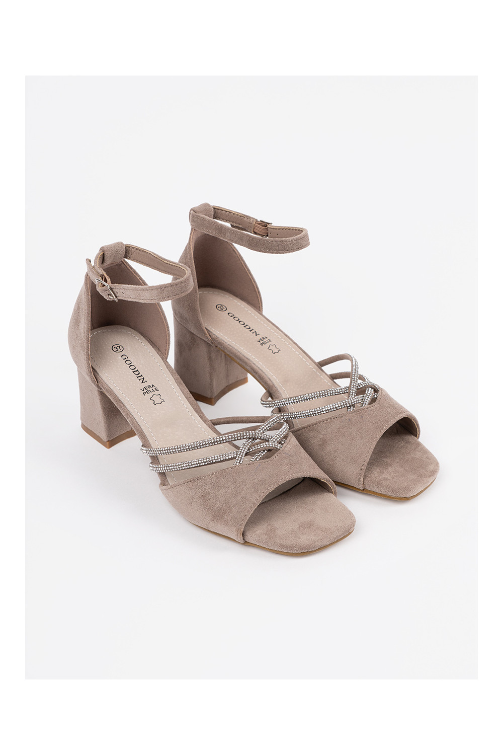 Smėlio spalvos zomšiniai moteriški sandalai ant kulno