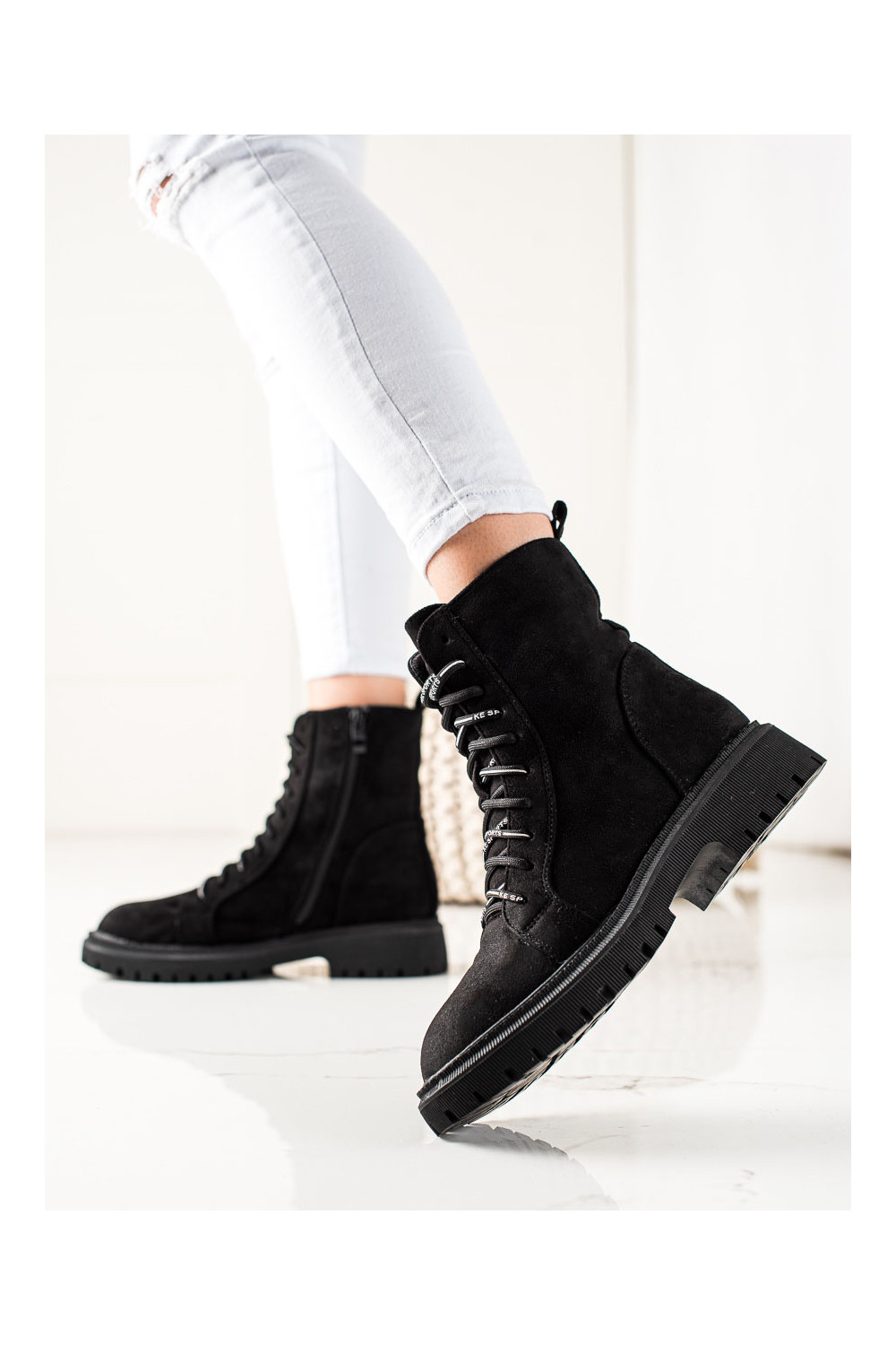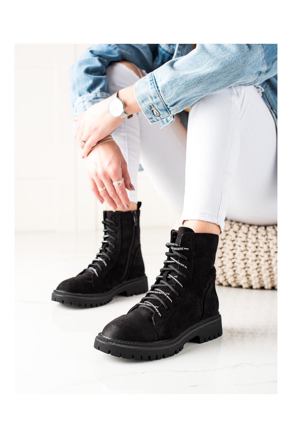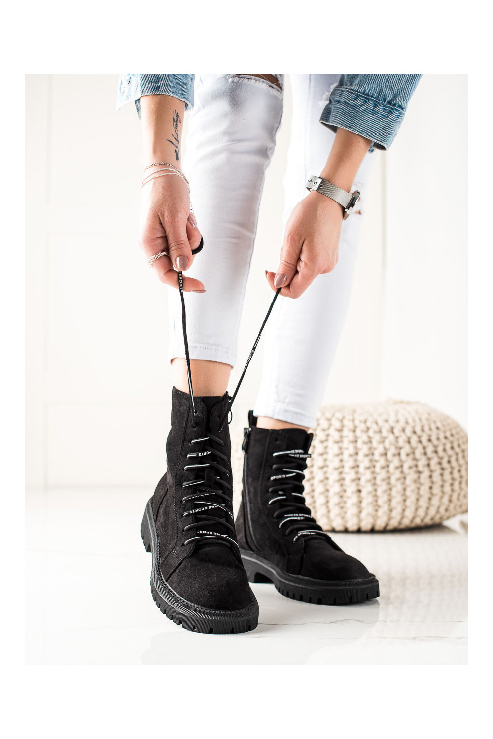 Mėgstami moteriški batai. Nėriniuoti batai iš zomšos imitacijos - idealus šio sezono pasiūlymas! Jie yra ant storo pado. Modelis nėra apšiltintas. Puikiai tinka rudens ir žiemos stilizacijai.