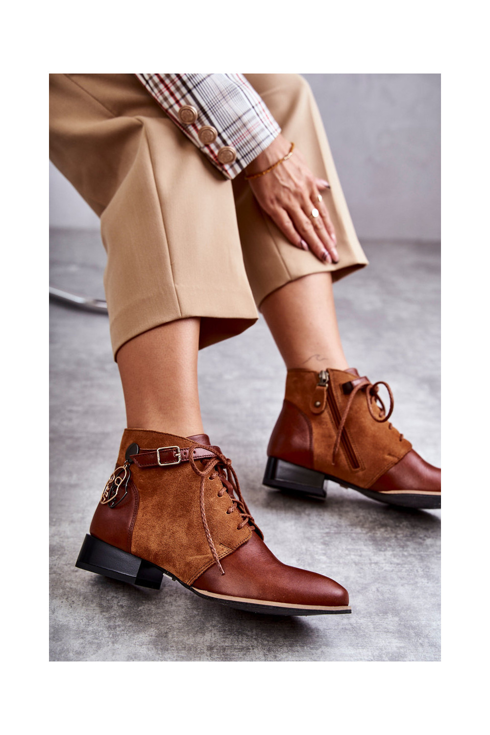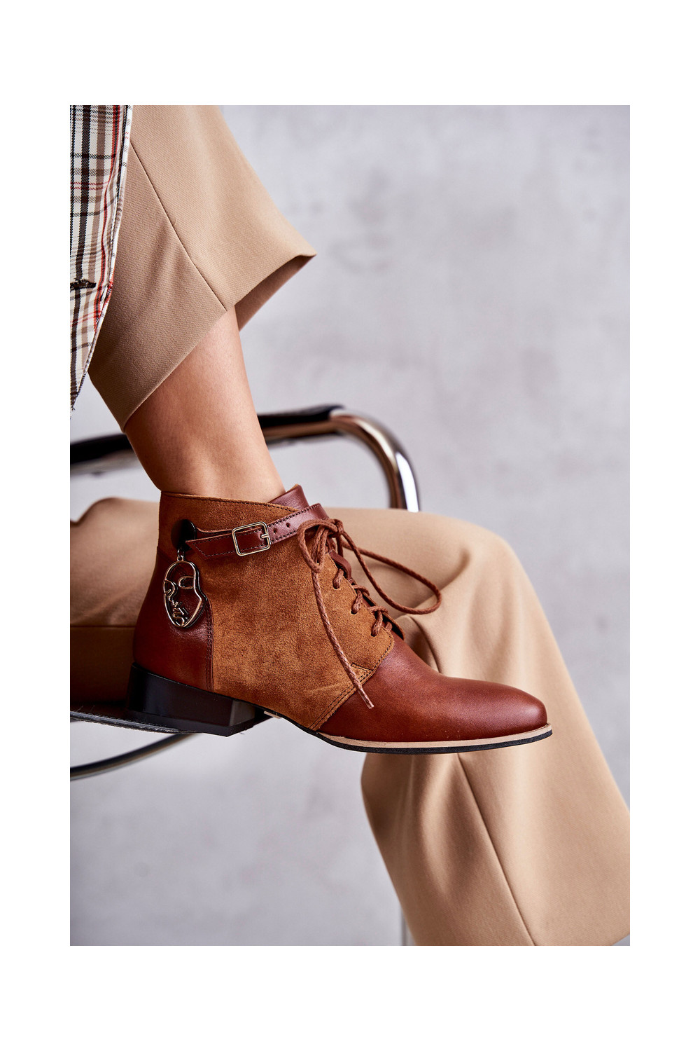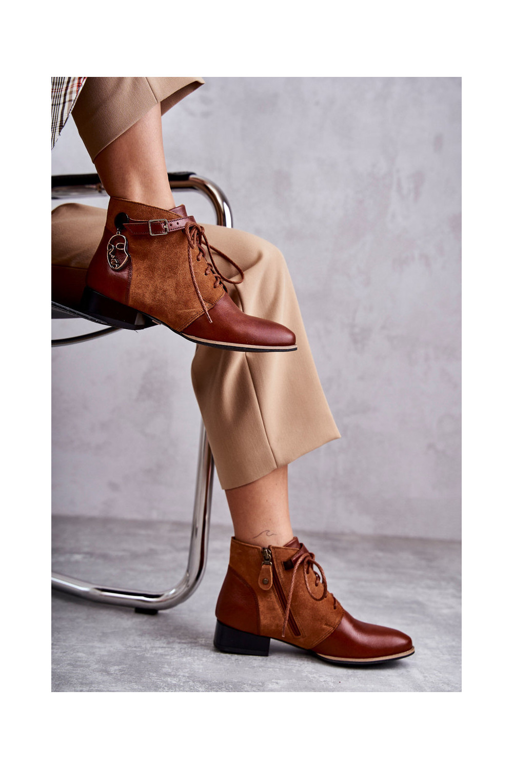 Mėgstami moteriški batai. Nėriniuoti batai iš zomšos imitacijos - idealus šio sezono pasiūlymas! Jie yra ant storo pado. Modelis nėra apšiltintas. Puikiai tinka rudens ir žiemos stilizacijai.