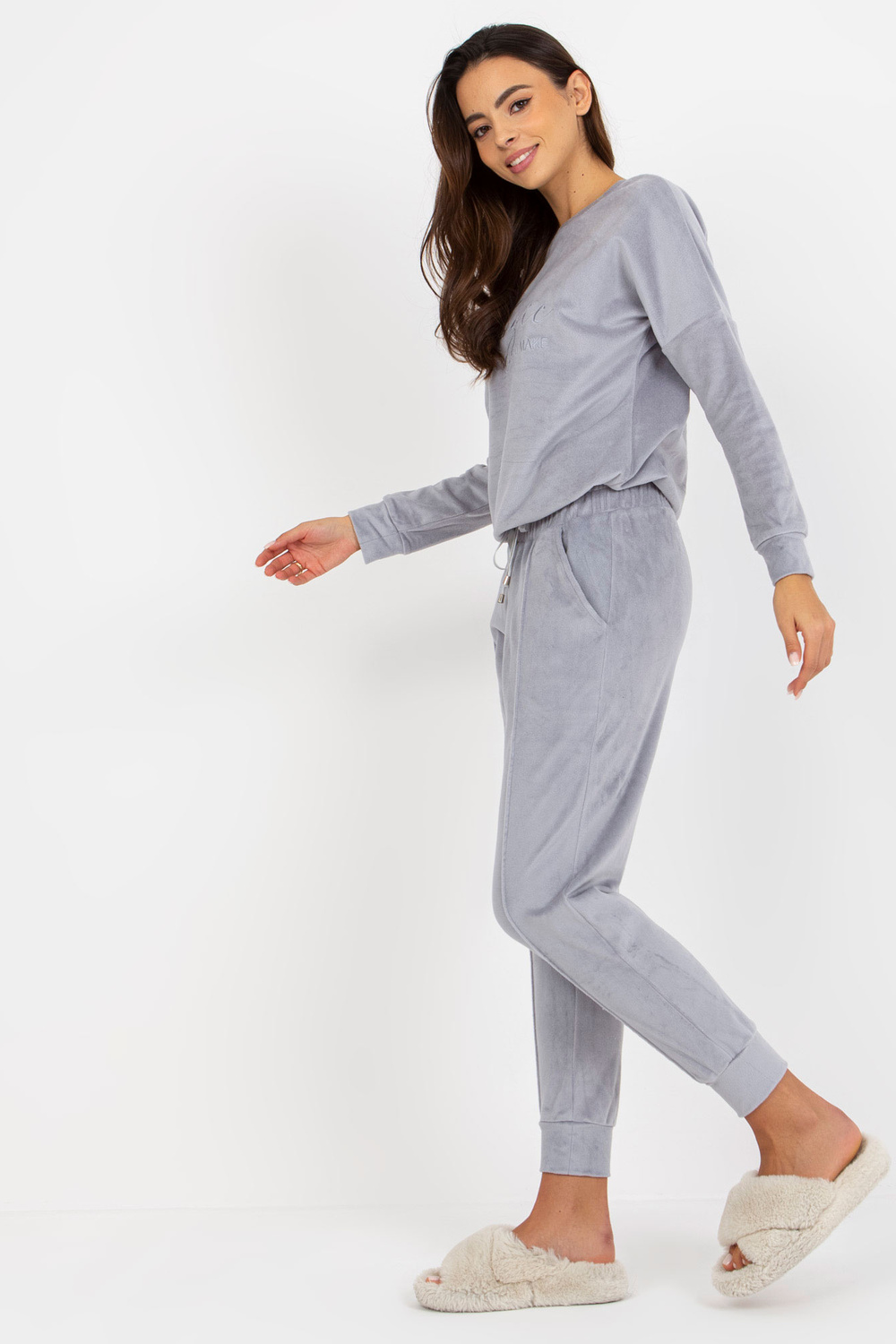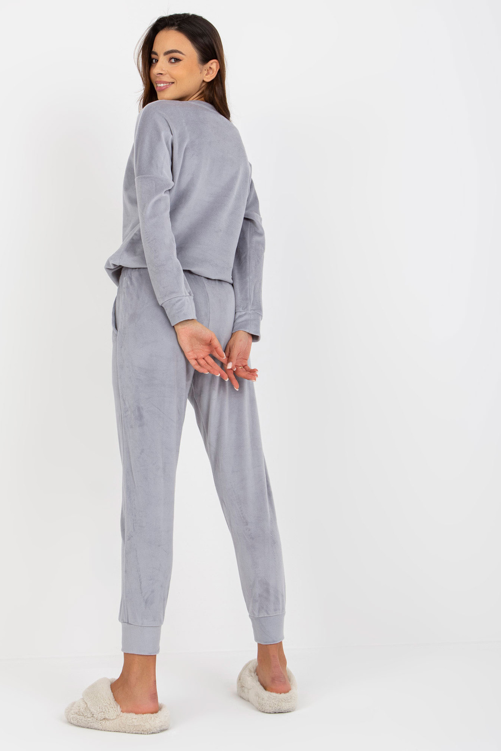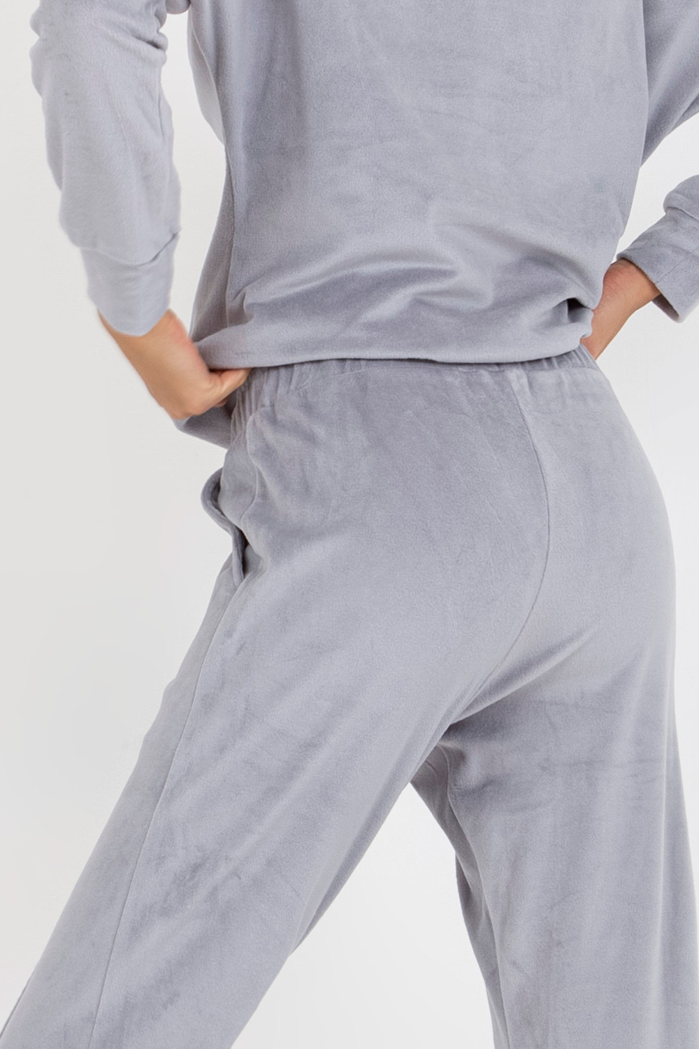 Komplekto matmenys S dydis matuojamas ant plokščio: pažasties plotis - 57 cm, megztinio ilgis - 60 cm, rankovių ilgis - 57 cm, juosmens plotis - 34 cm, juosmens aukštis - 28 cm, kelnių ilgis - 91 cm.