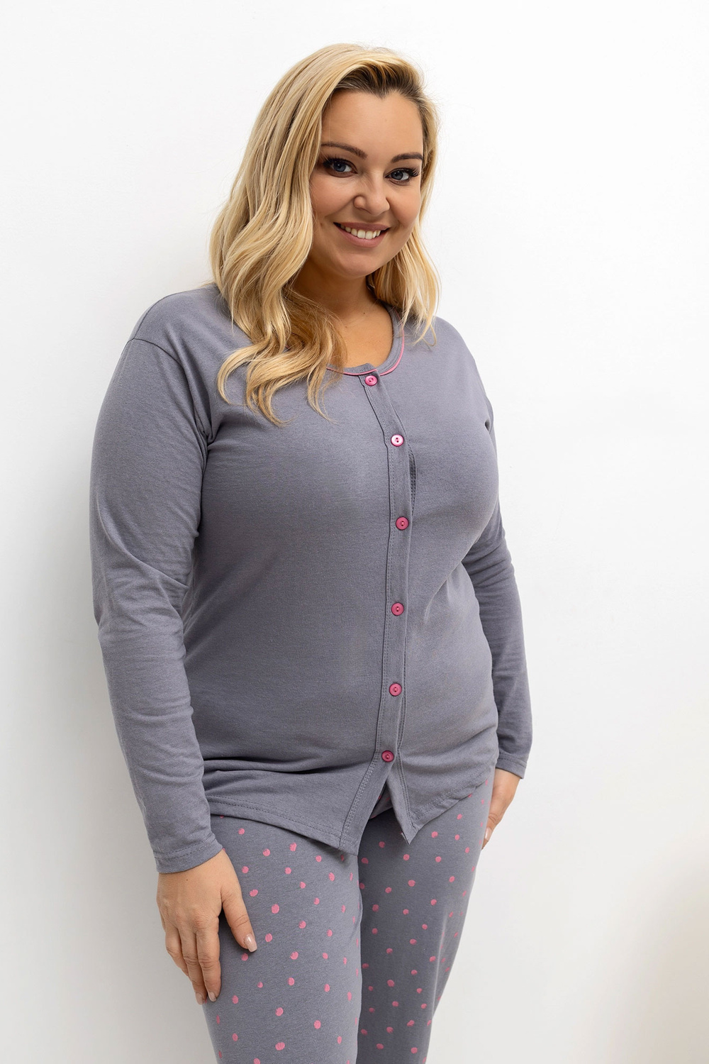 Pižamos XL dydžio matmenys išmatuoti gulint: palaidinė: plotis po pažastimis - 56 cm, rankovės ilgis - 60 cm, bendras ilgis - 70 cm, apačios plotis - 56 cm, kelnės: juosmens plotis - 38 cm (gulint), juosmens plotis - 72 cm (ištemptos), klubų plotis - 58 cm, bendras ilgis - 97 cm.