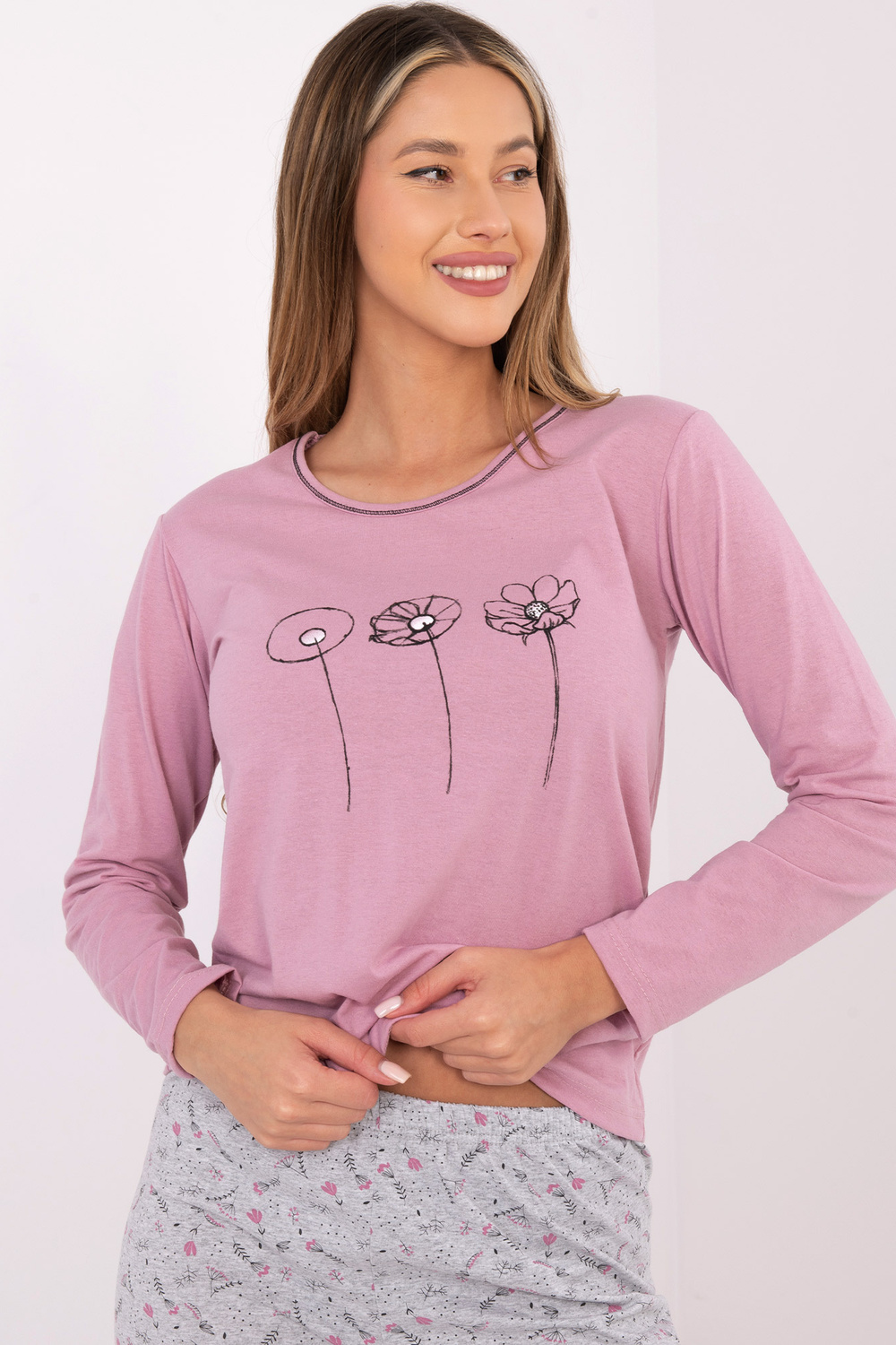 M dydžio pižamos matmenys ištiestų drabužių: palaidinė: plotis po pažastimis – 44 cm, rankovės ilgis – 60 cm, bendras ilgis – 61 cm, apačios plotis – 48 cm; kelnės: juosmens plotis – 31 cm (ištiesta), juosmens plotis – 54 cm (ištempta), klubų plotis – 51 cm, bendras ilgis – 97 cm.