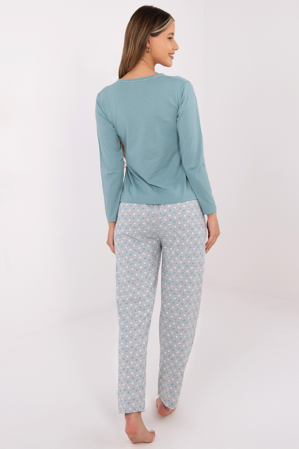 M dydžio pižamos matmenys išmatuoti plokščiai: palaidinė: plotis pažastyse – 44 cm, rankovės ilgis – 58 cm, bendras ilgis – 58 cm, apačios plotis – 49 cm, kelnės: juosmens plotis – 33 cm (plokščiai), juosmens plotis – 62 cm (ištemptos), klubų plotis – 51 cm, bendras ilgis – 100 cm.