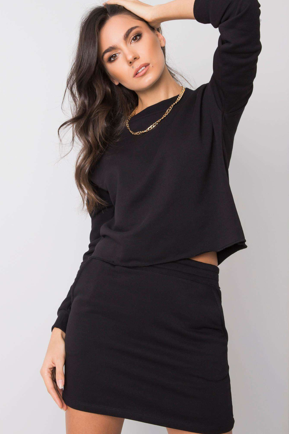 S dydžio rinkinio matmenys išmatuotas plokščias: plotis po pažastimis - 53 cm, megztinio ilgis - 47 cm, rankovių ilgis - 53 cm, juosmens plotis - 32 cm, sijono ilgis - 40 cm