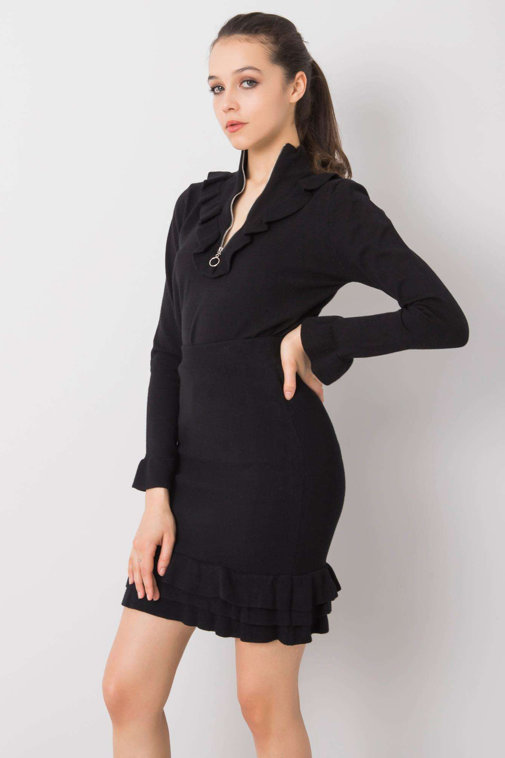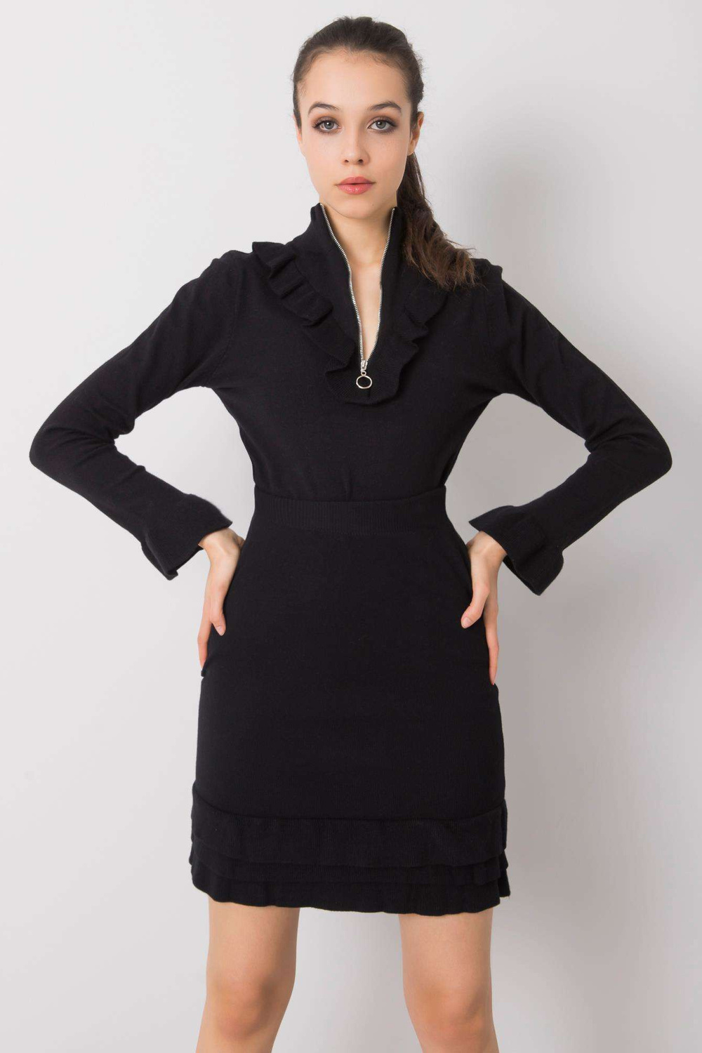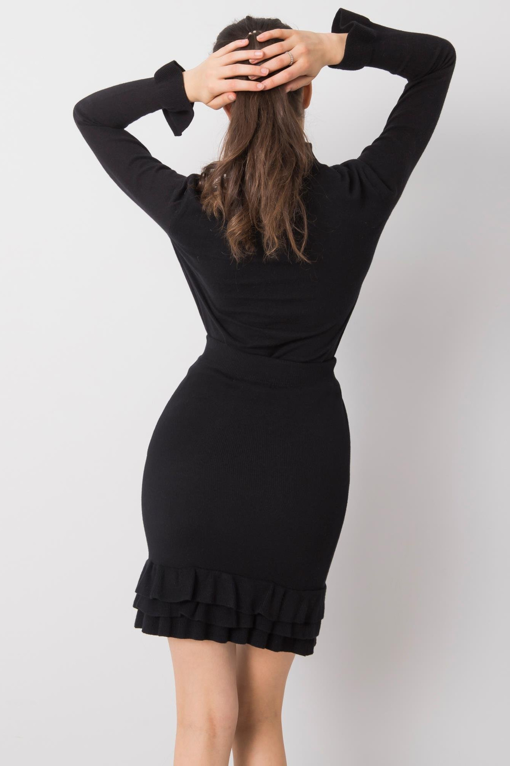 Rinkinio matmenys S dydžiu matuojant plokščią: plotis po pažastimis - 42 cm , megztinio ilgis - 55 cm, rankovių ilgis - 61 cm, juosmens plotis - 31 cm, sijono ilgis - 52 cm