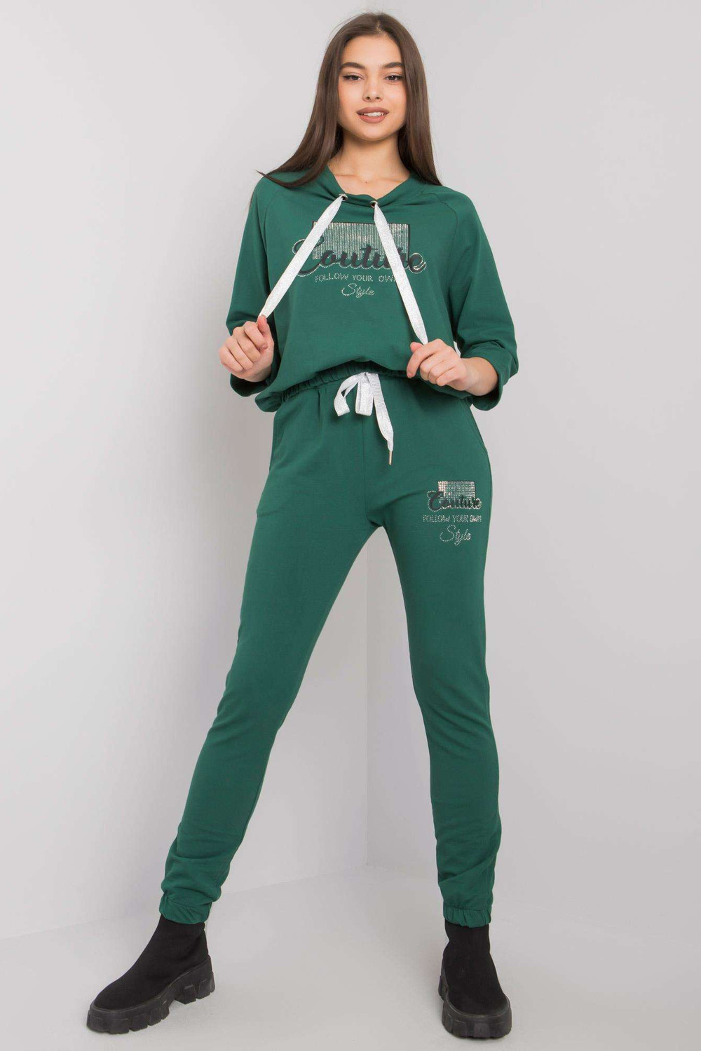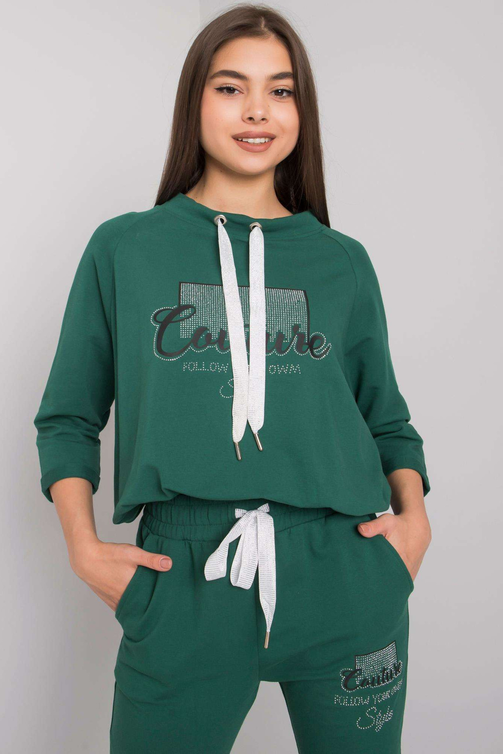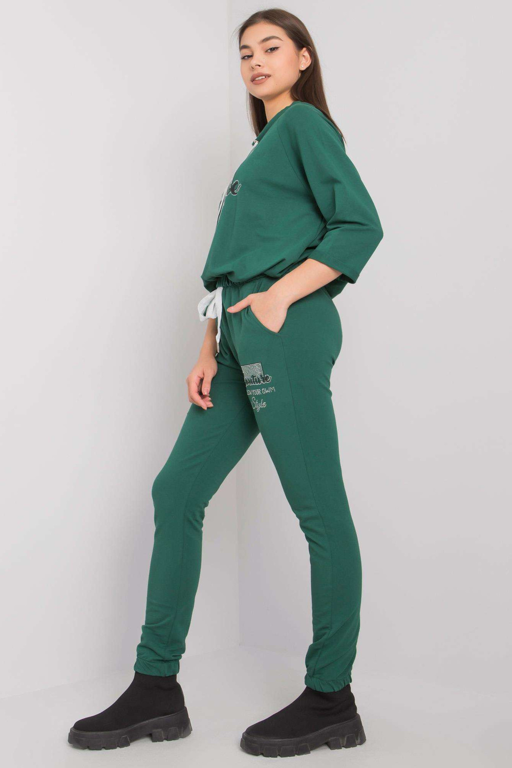 Tamsiai žalios spalvos rinkinys su Martille programomis. Į komplektą įeina: megztinis, kelnės medžiagos sudėtis: 90% medvilnė, 10% elastanas skalbimo būdas: skalbimas mašinoje 30°C. Modelis dėvi S/M dydį. Modelio matmenys: aukštis 172 cm, krūtinė 88 cm, juosmuo 61 cm, klubai