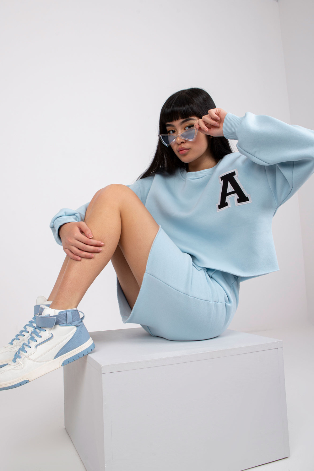 Šviesiai mėlynas megztinių komplektas su Brixen sijonu.