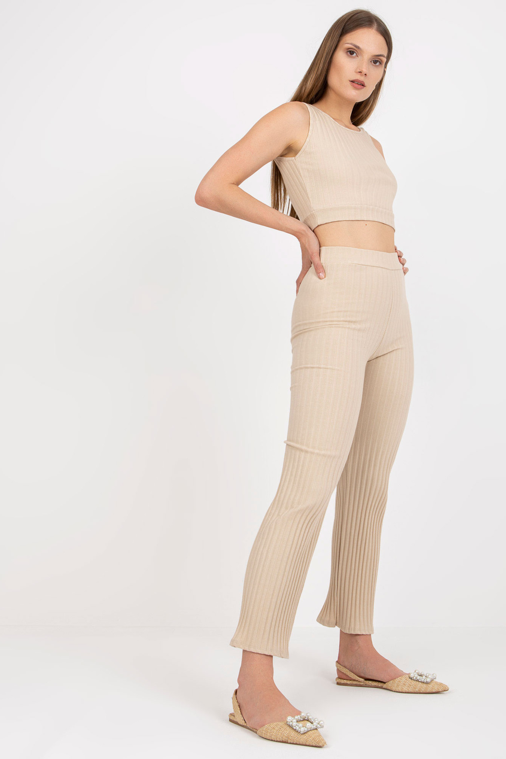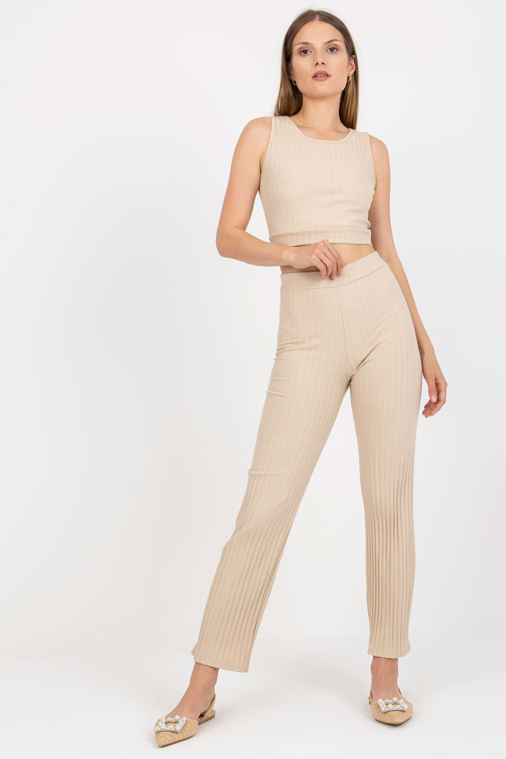 Smėlio spalvos dviejų dalių laisvalaikio komplektas su dryžiais
