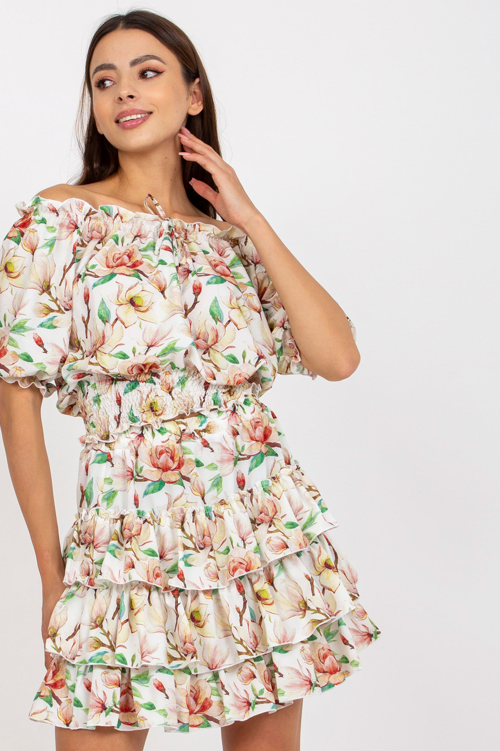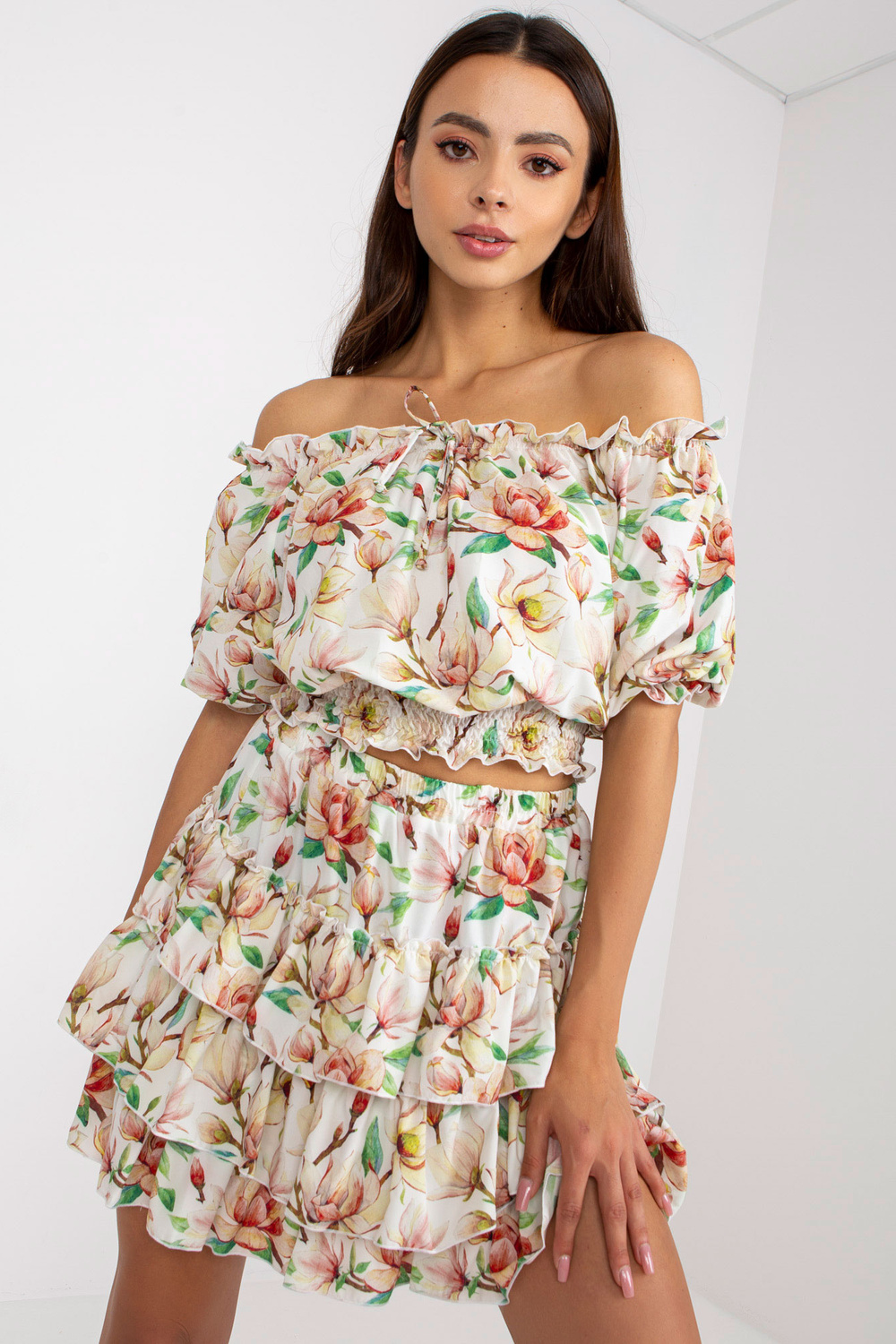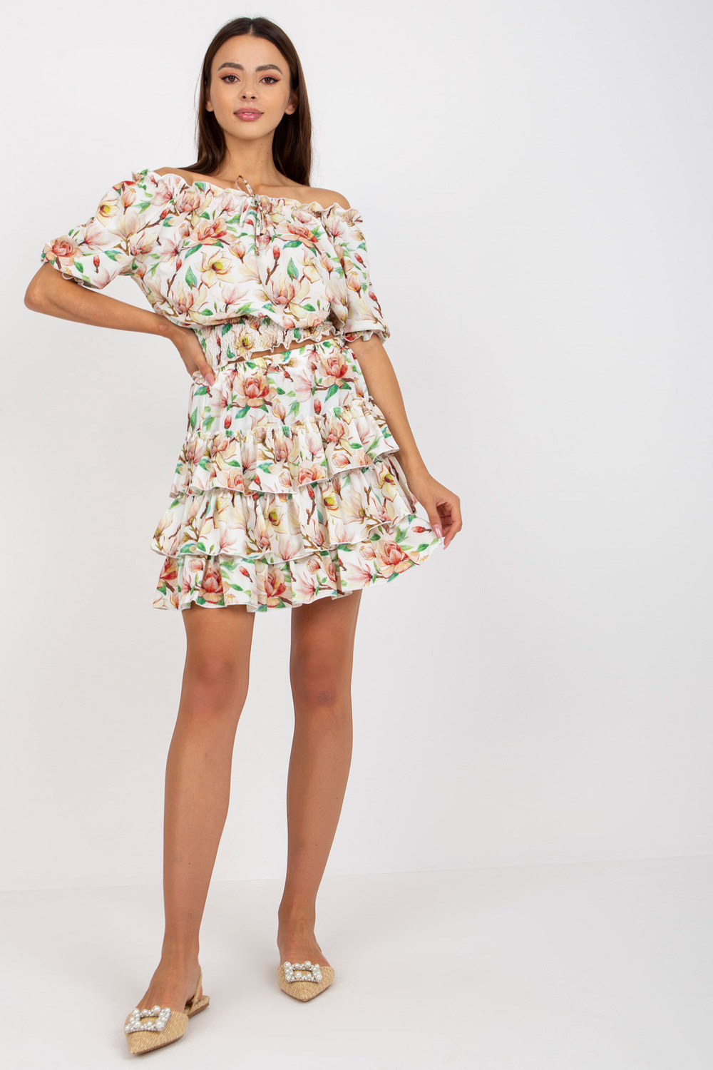 S/M dydžio rinkinio matmenys išmatuoti plokščiai: palaidinės plotis po pažastimis - 45 cm, palaidinės ilgis - 47 cm, palaidinės plotis sijonas ties juosmeniu - 33 cm, sijono ilgis - 44 cm.