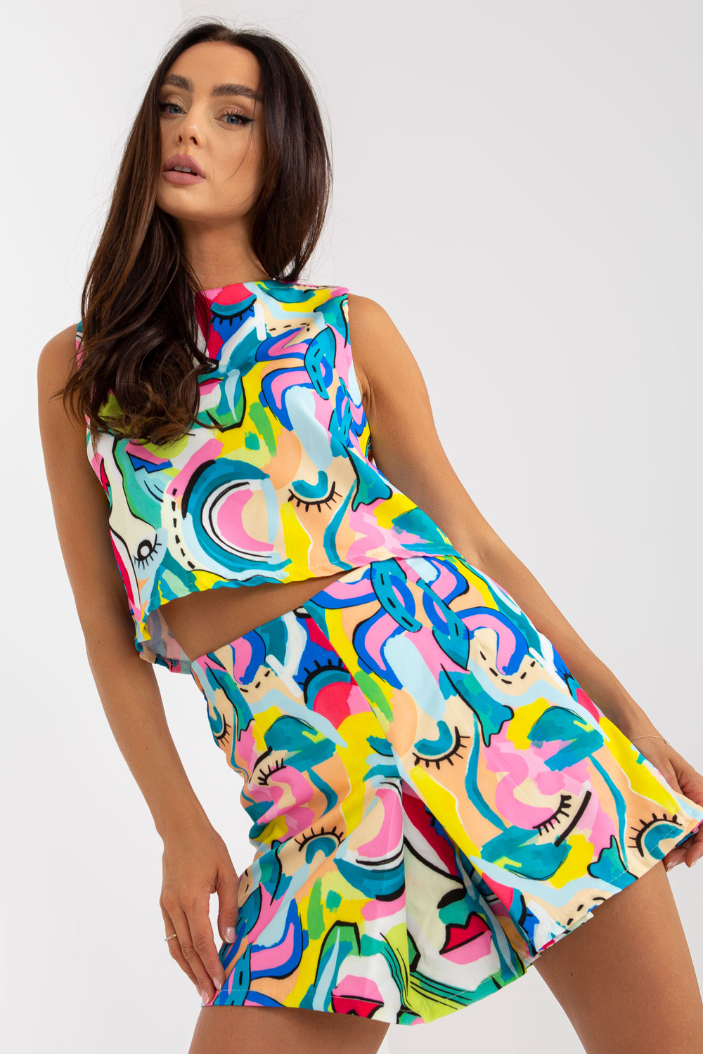 Komplekto matmenys S dydžio matuojant plokščią: viršutinės dalies plotis po pažastimis - 43 cm, viršutinės dalies ilgis - 42 cm, šortų plotis ties juosmeniu - 33 cm, būklės aukštis - 34 cm, šortų ilgis - 38 cm.