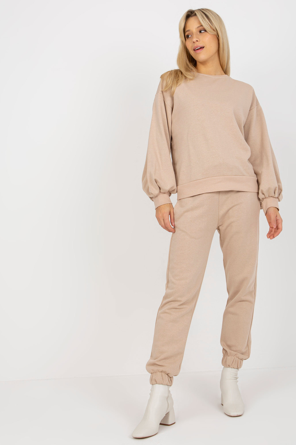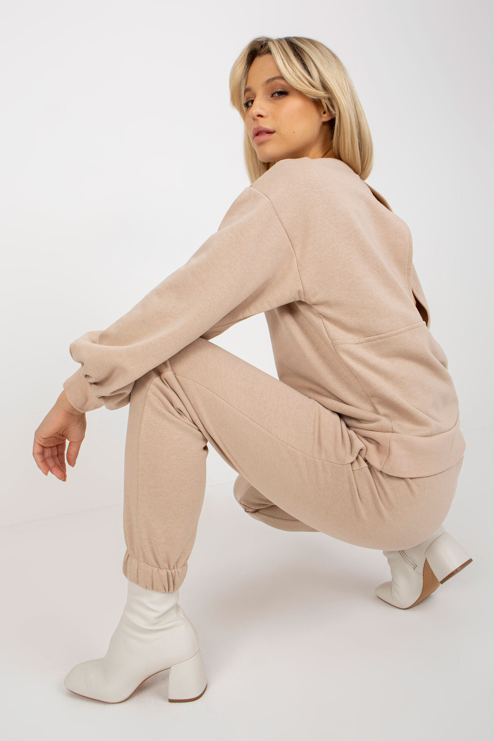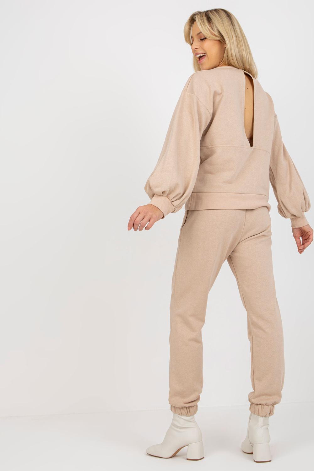 Smėlio spalvos laisvalaikio rinkinys su atvira nugara megztiniu.
