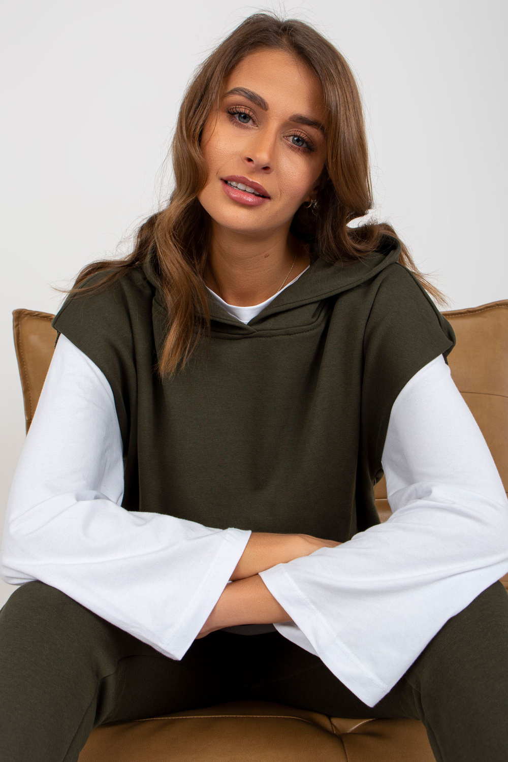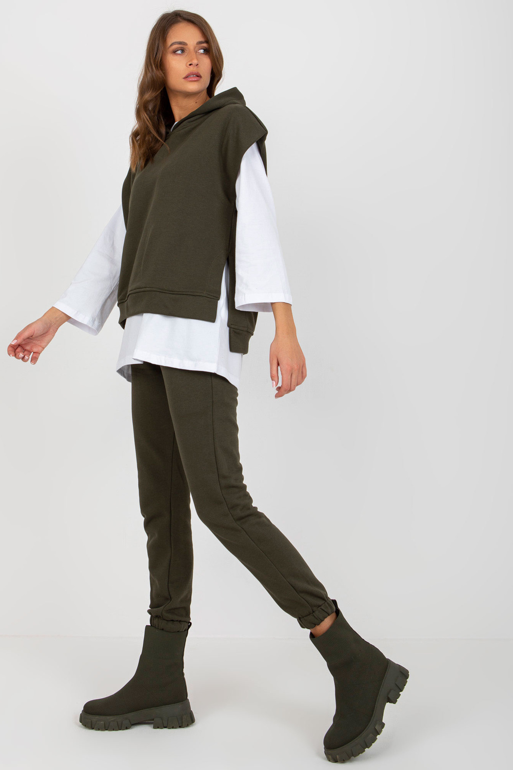 Chaki spalvos trijų dalių laisvalaikio rinkinys su gobtuvu.