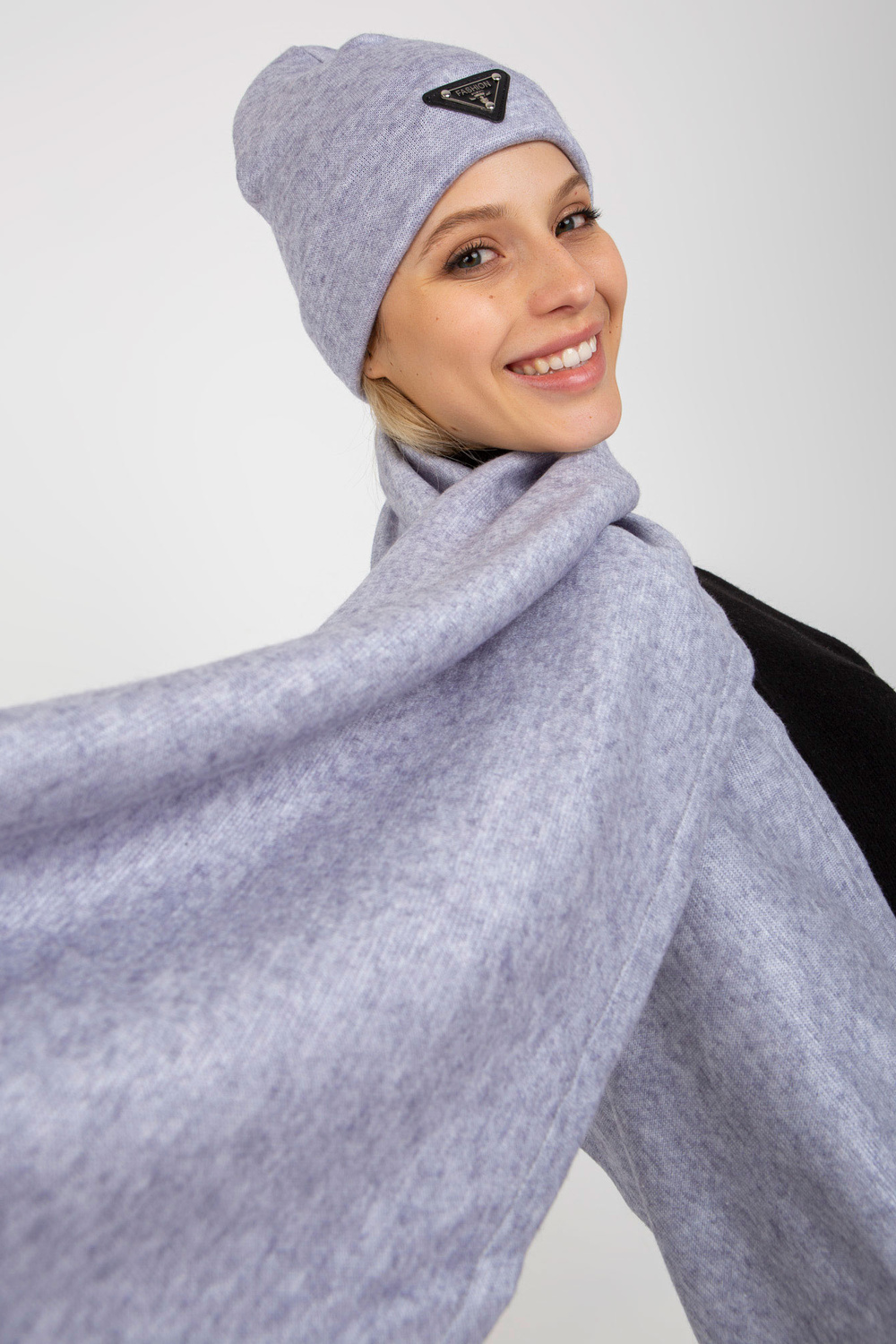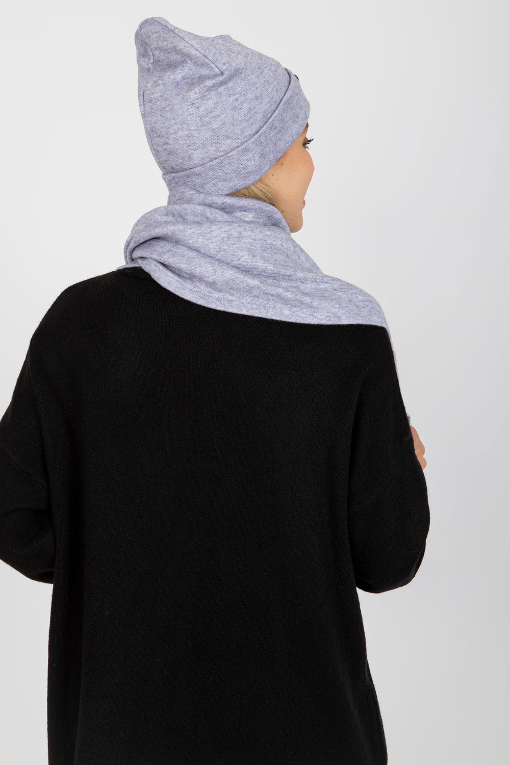Šviesiai violetinis žiemos komplektas su skara ir kepure.