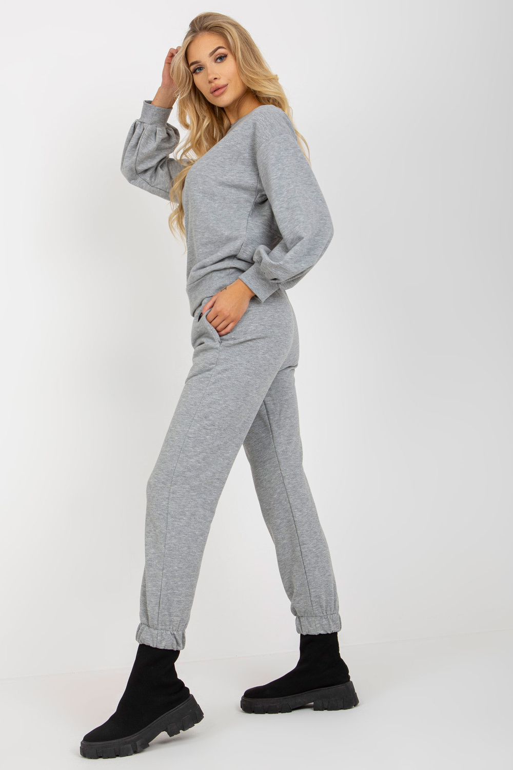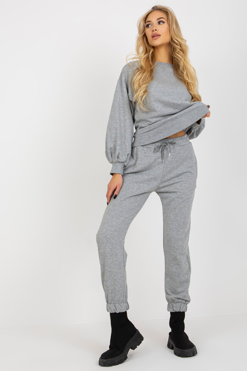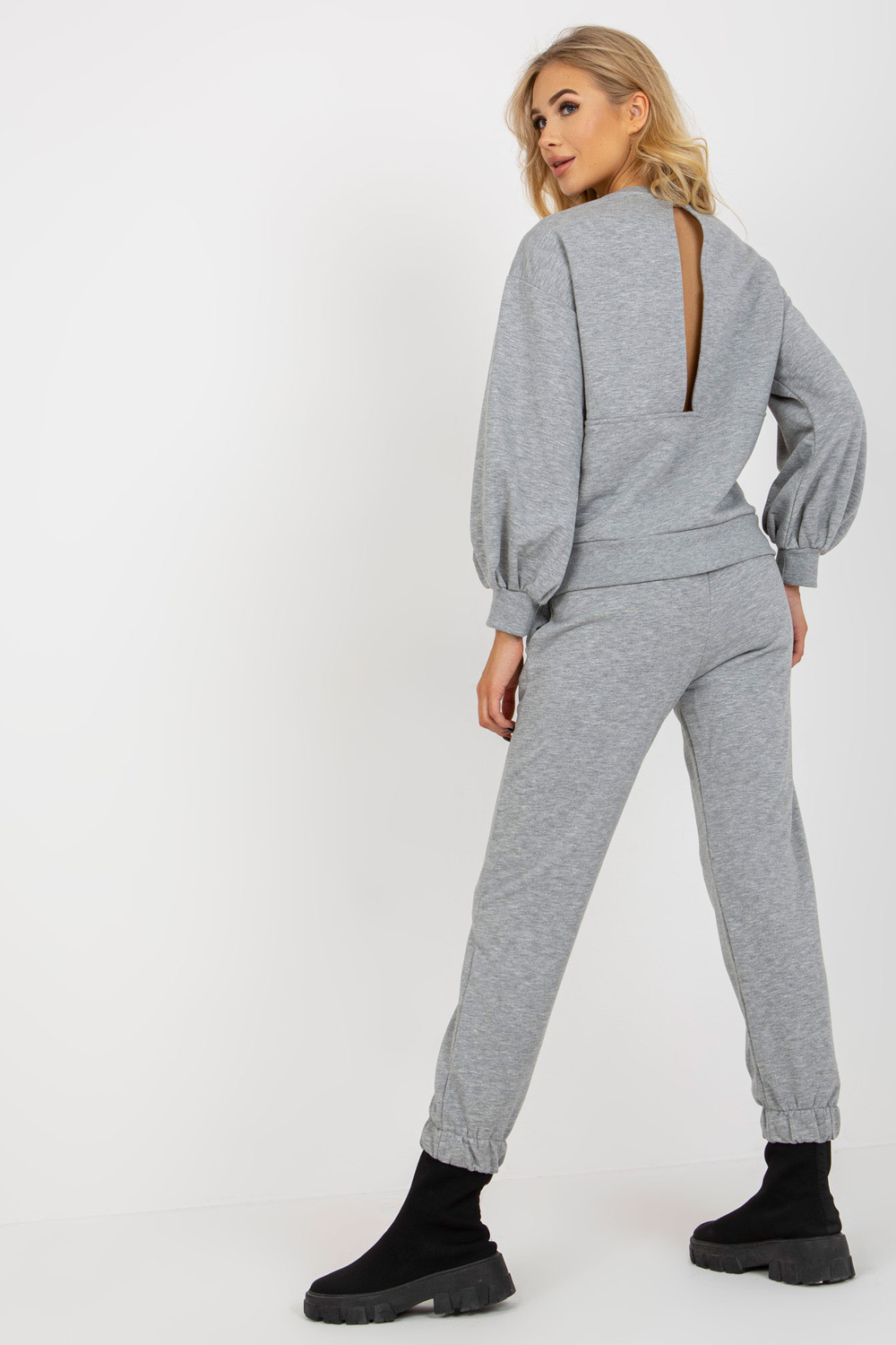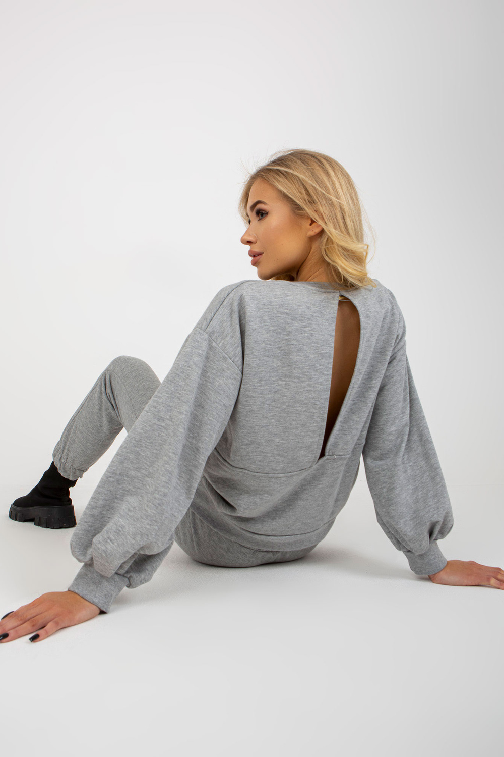 Pilkas dviejų dalių laisvalaikio komplektas su išpjova nugaroje.