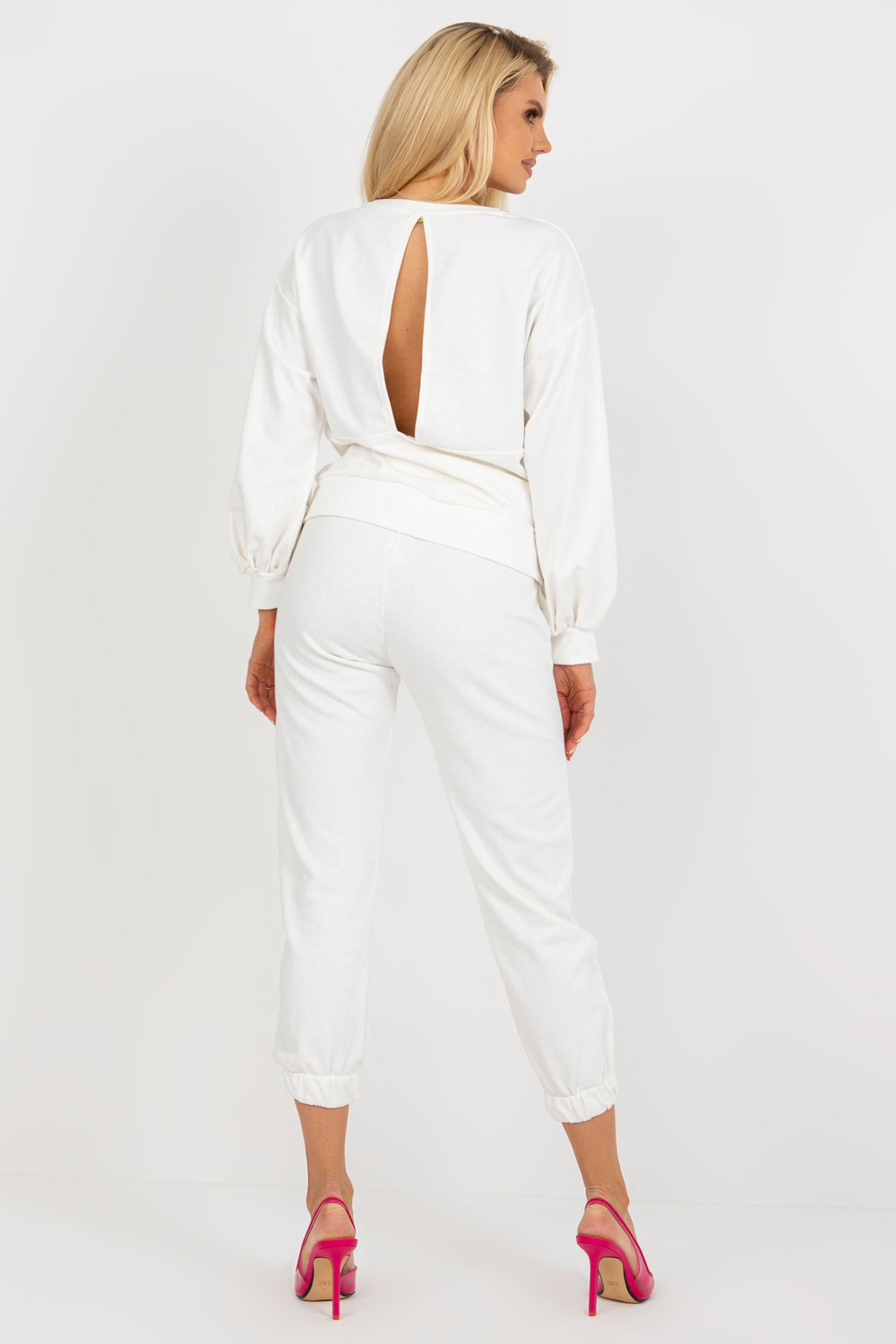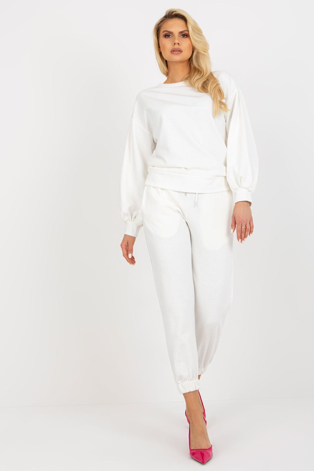 Ecru laisvalaikio rinkinys su megztiniu plačiomis rankovėmis.