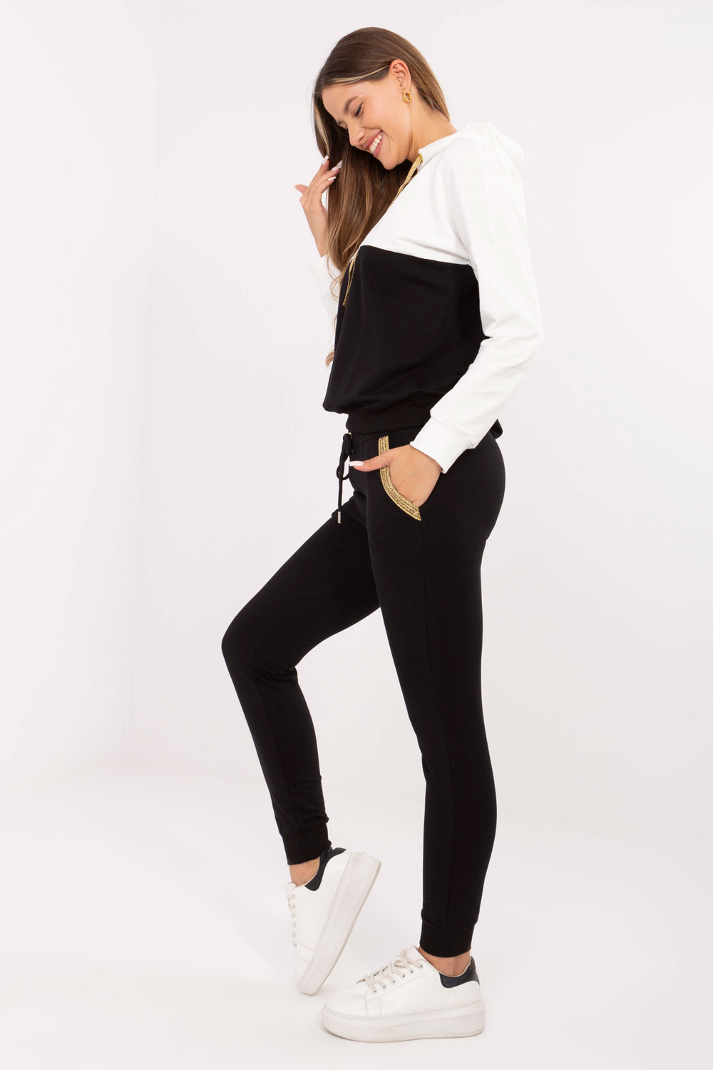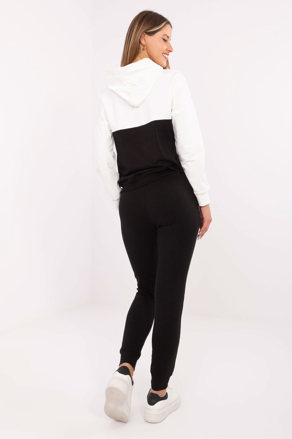 Ecru-juodas moteriškų megztinių komplektas su gobtuvu.