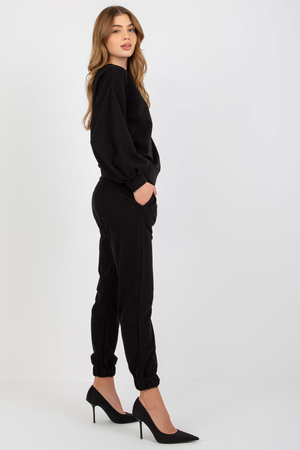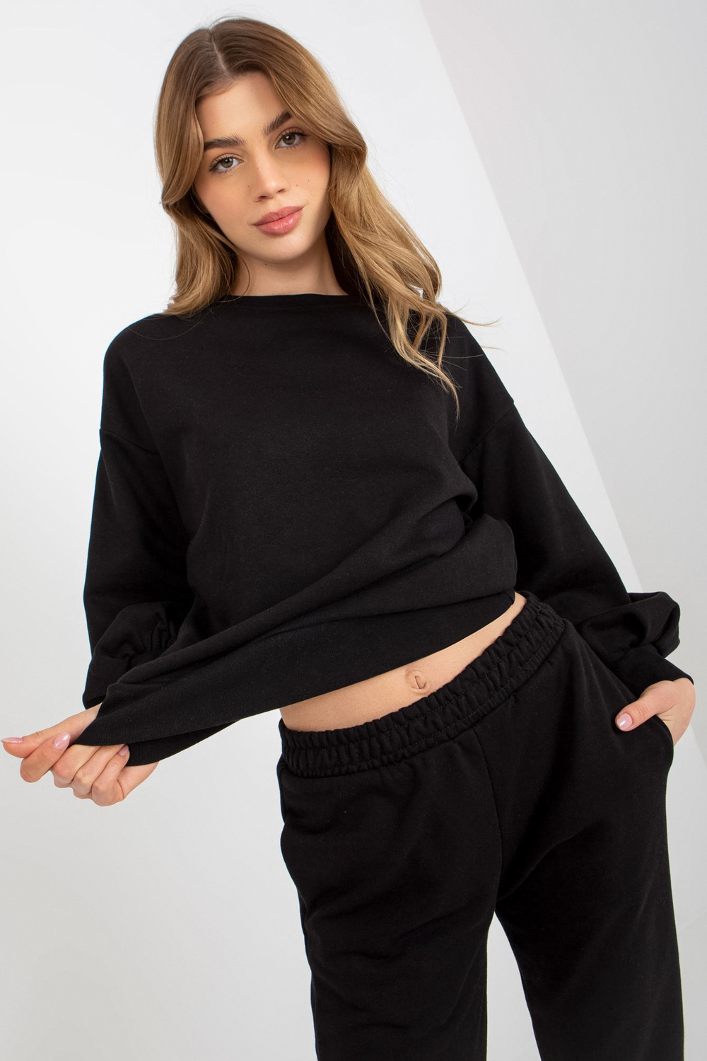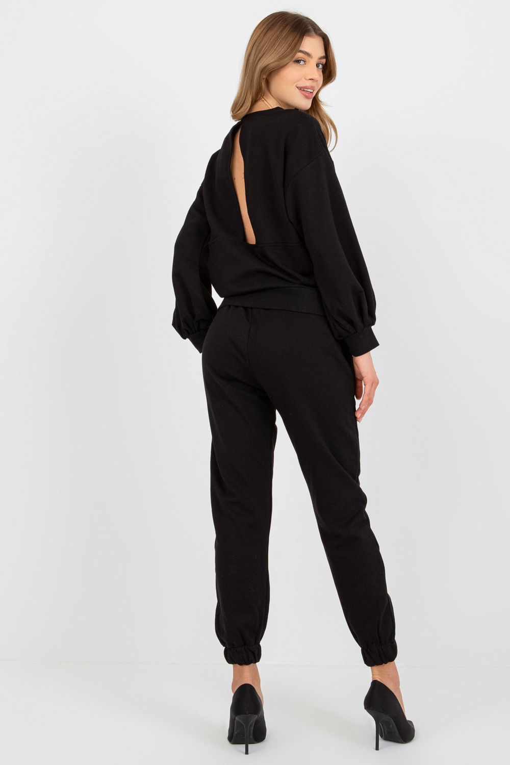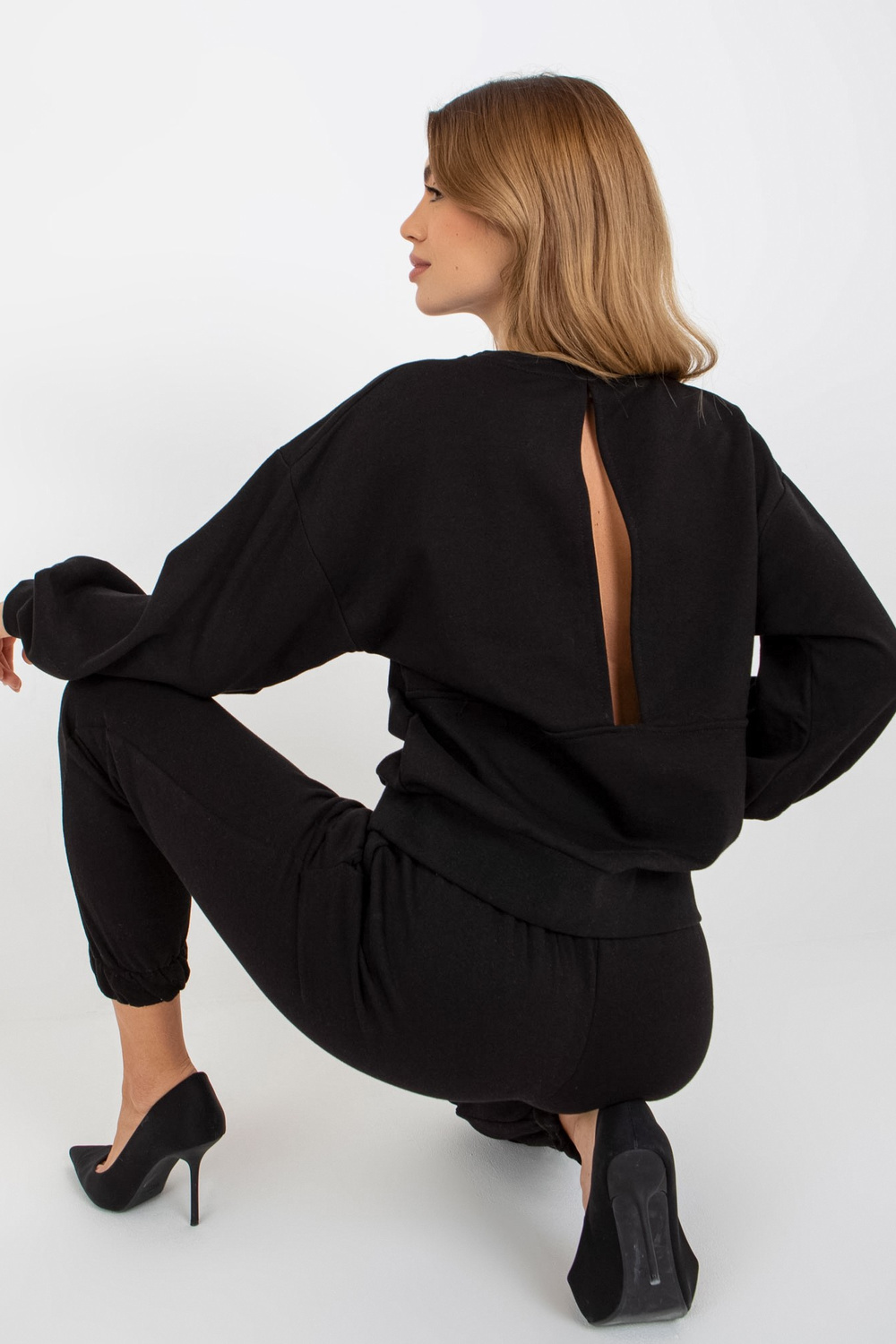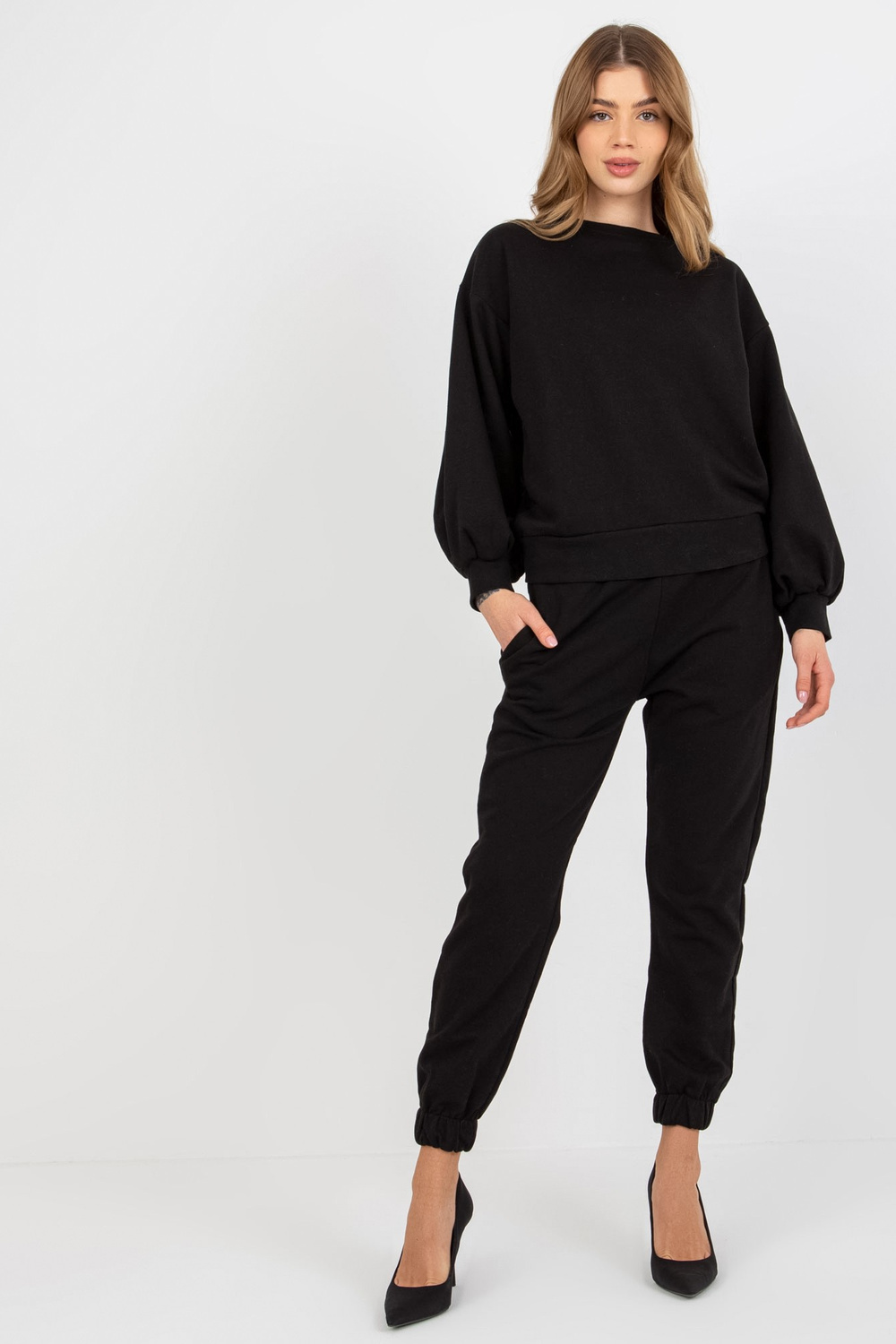 Juodas laisvalaikio komplektas su megztiniu plačiomis rankovėmis.