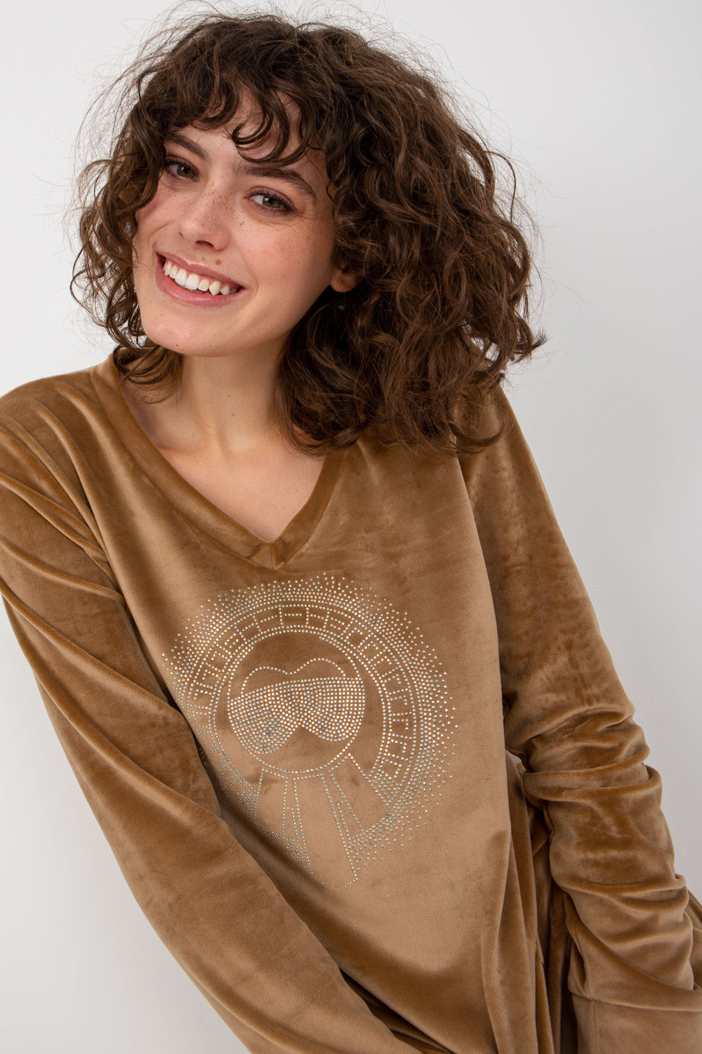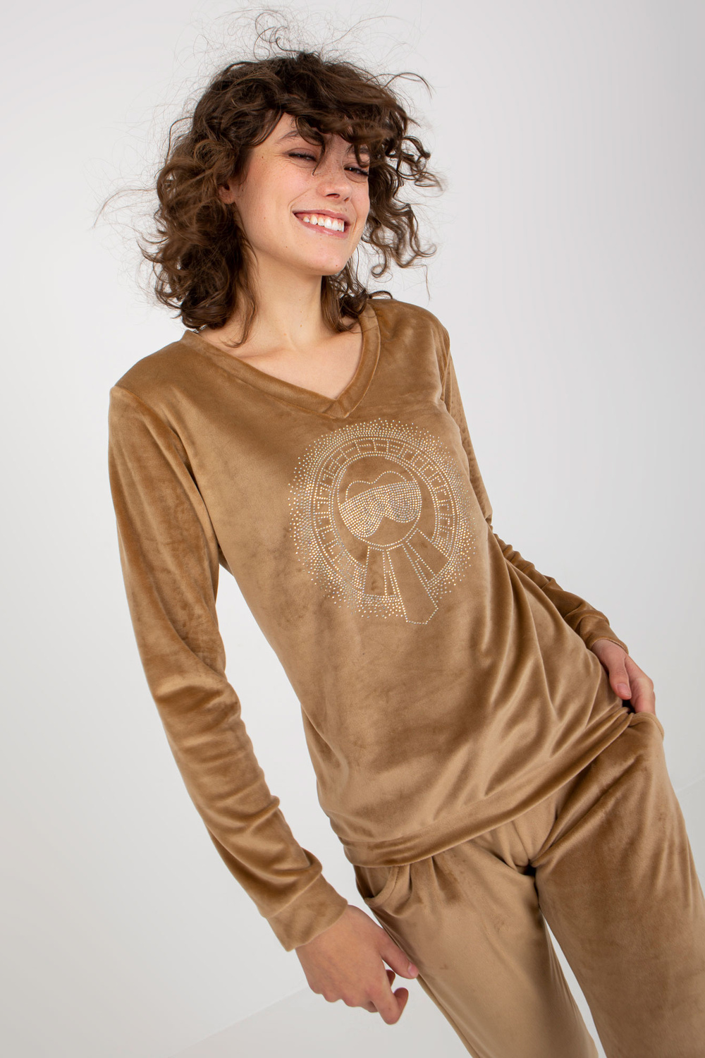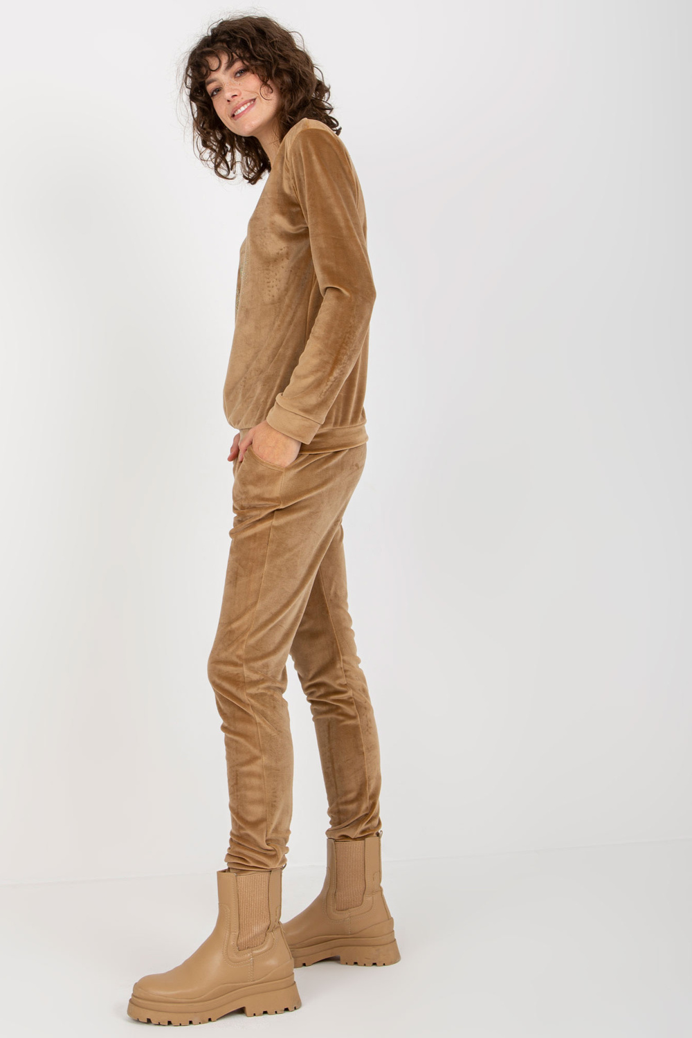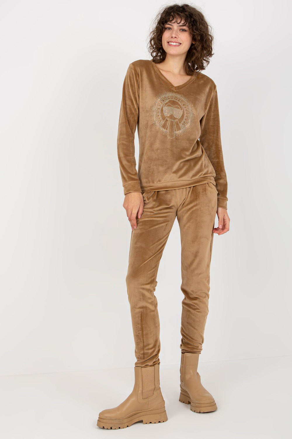 Moteriškas kupranugarių veliūrinis rinkinys su V formos iškirpte.