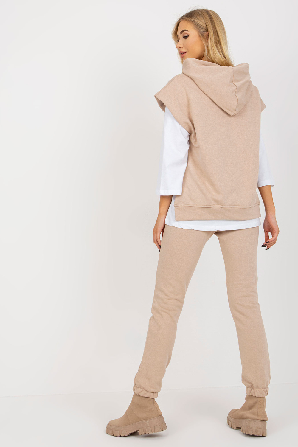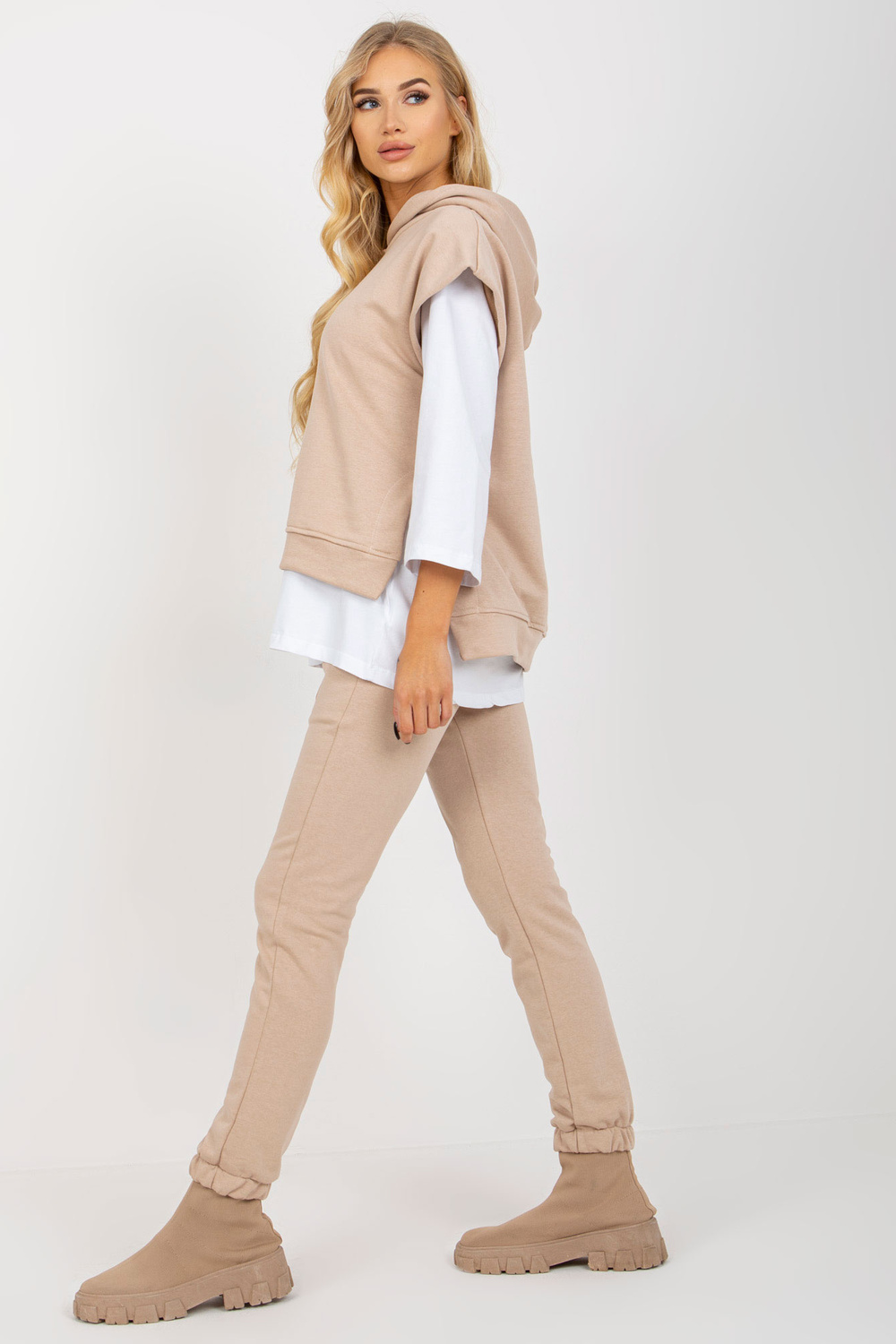 Smėlio spalvos trijų dalių laisvalaikio rinkinys su kelnėmis.