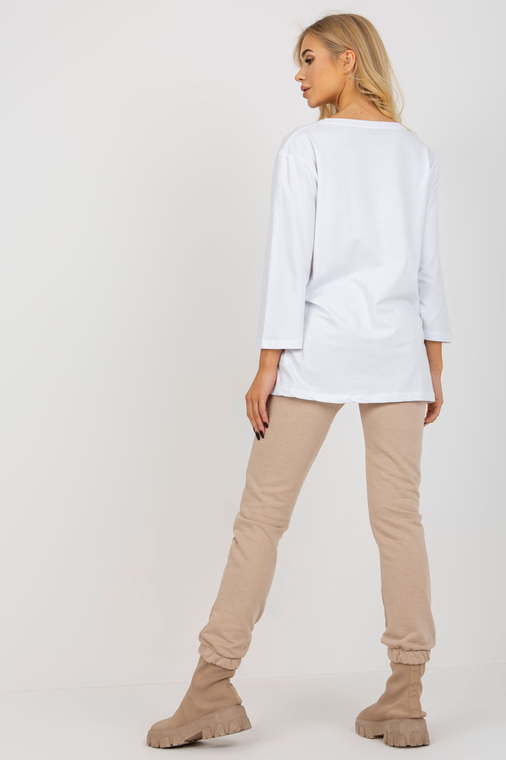 Komplekto matmenys vieno dydžio matuojant plokščią: megztinio plotis po pažastimis - 55 cm, megztinio ilgis - 65 cm, palaidinės plotis po pažastimis - 55 cm, rankovių ilgis - 52 cm, palaidinės ilgis - 75 cm, kelnių plotis ties juosmeniu - 34 cm, būklės aukštis - 30 cm, kelnių ilgis - 95 cm.