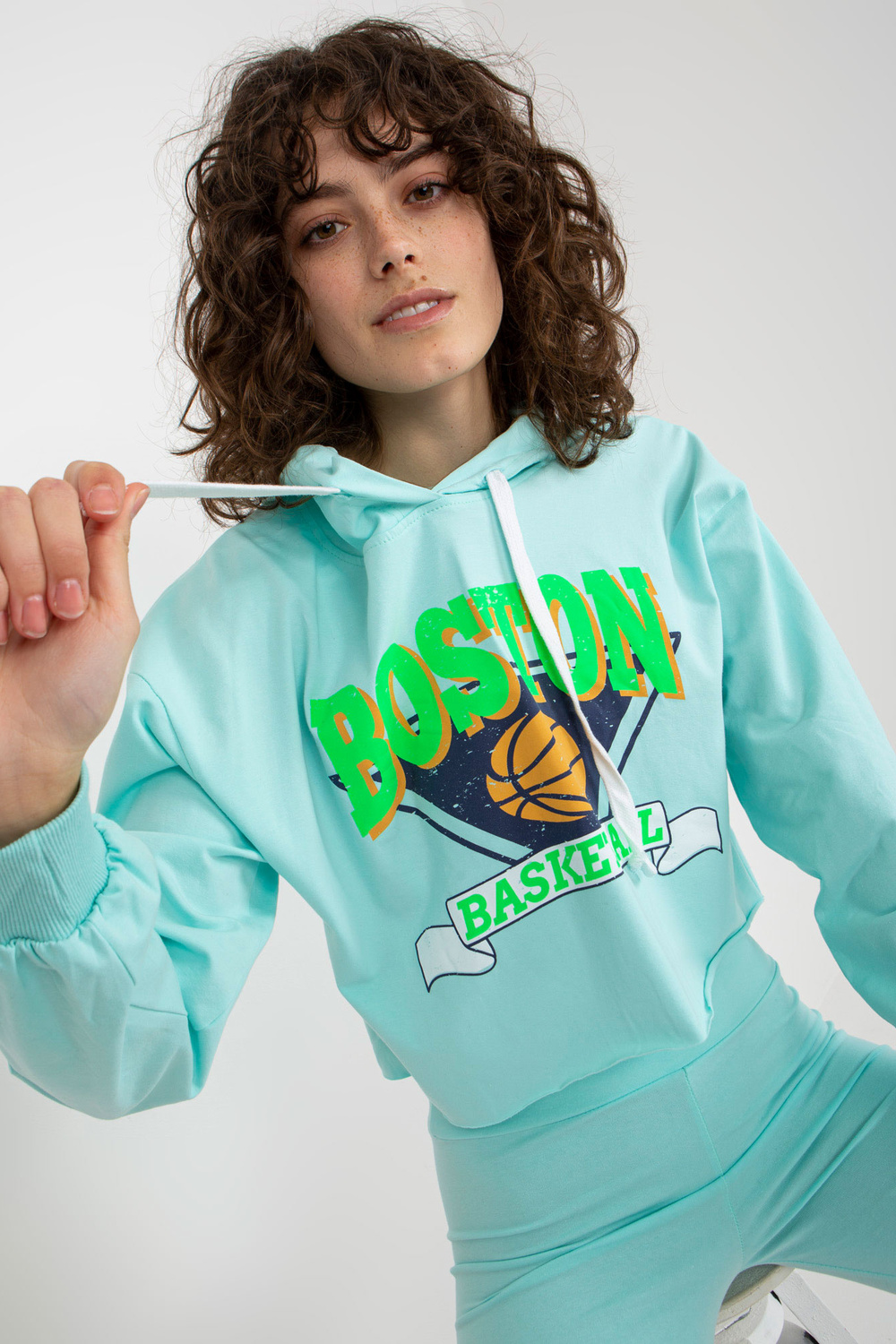 Mėtų laisvalaikio rinkinys su trumpu megztiniu ir dviračiu.