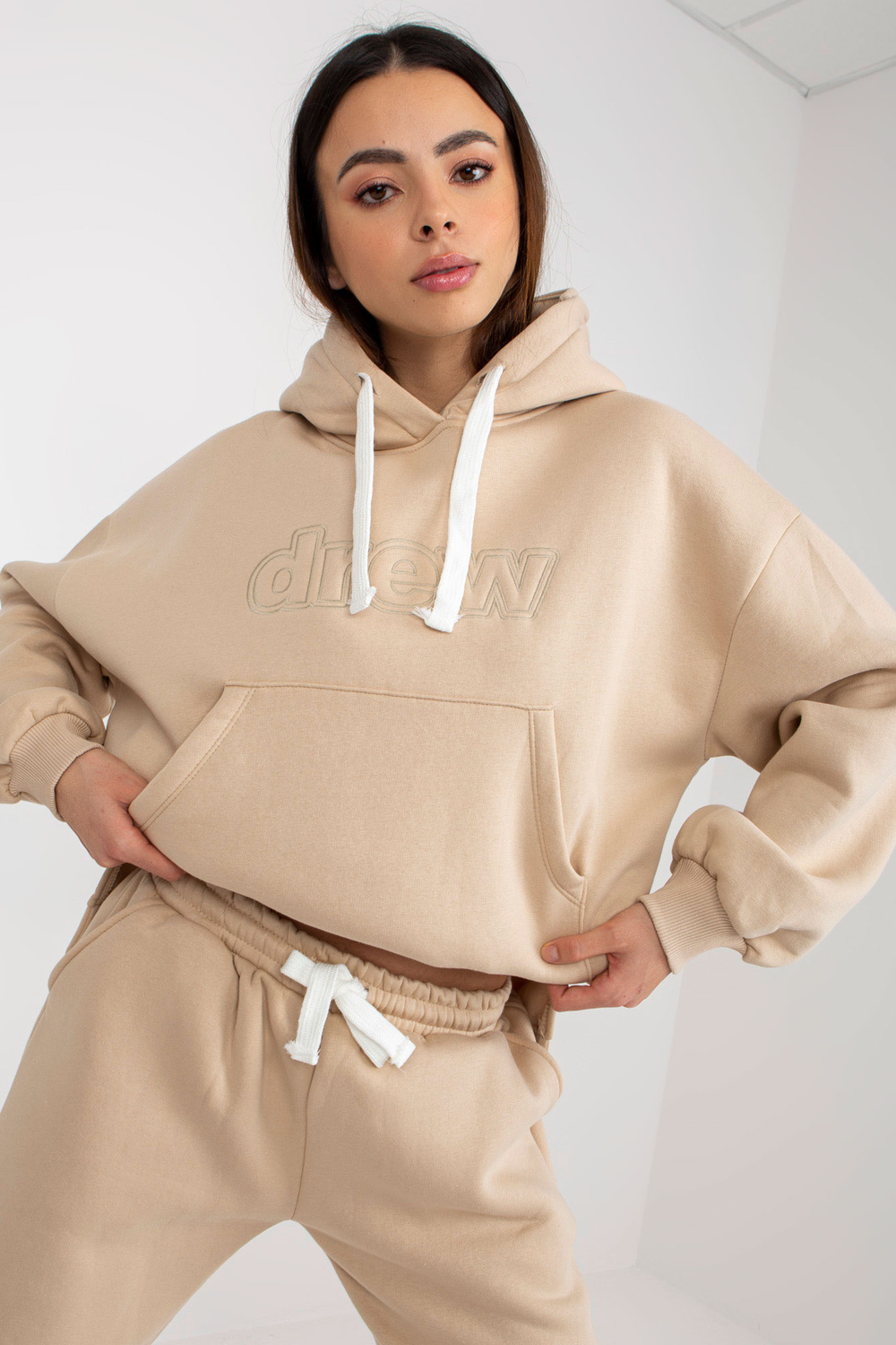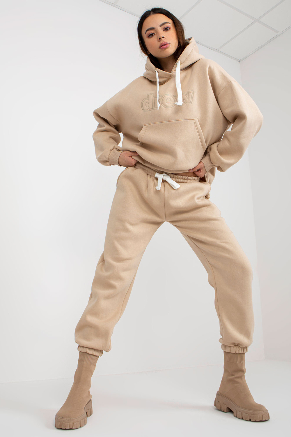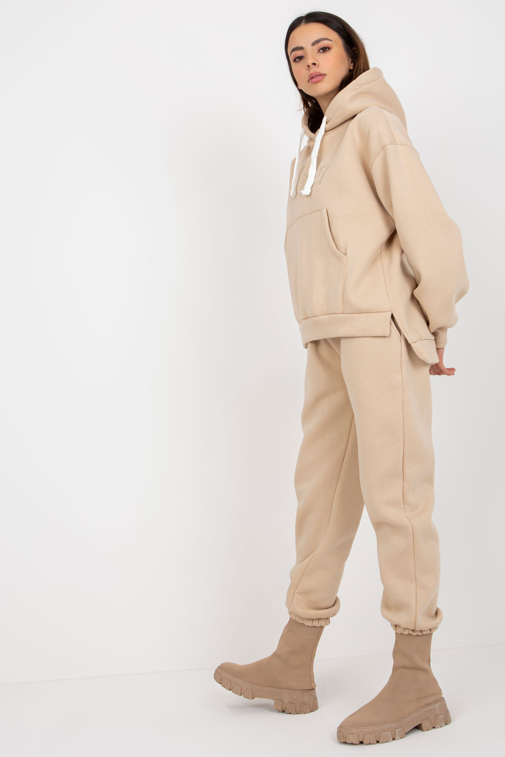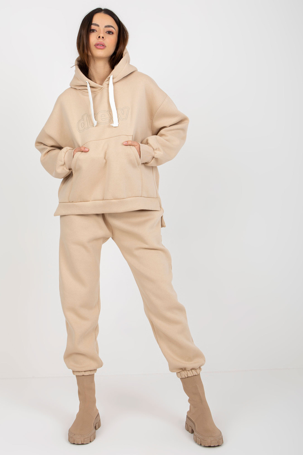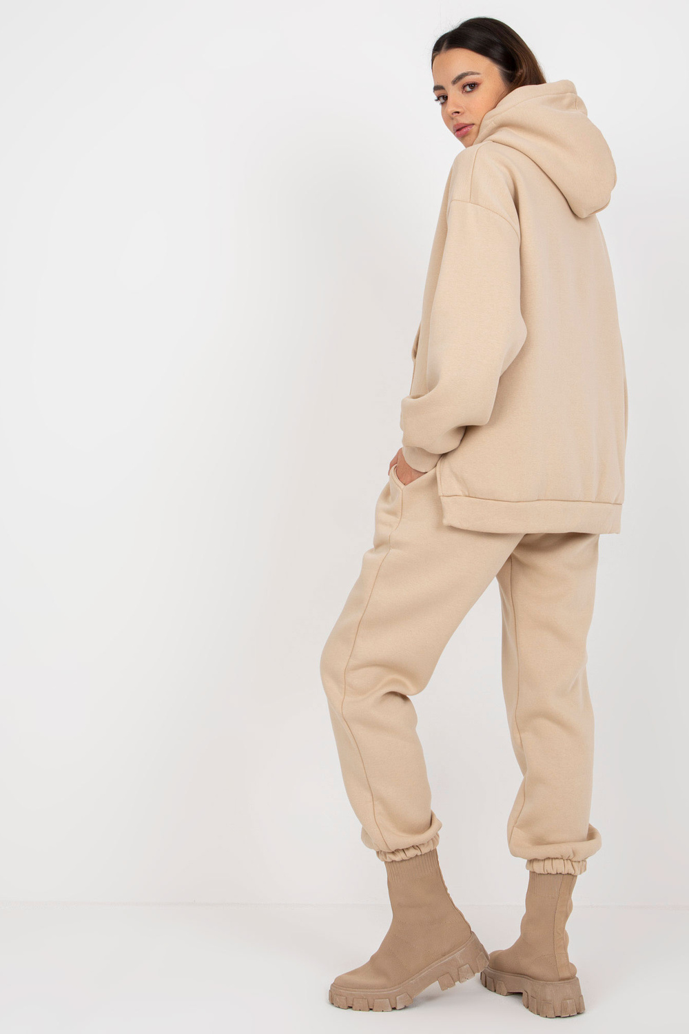 Smėlio spalvos dviejų dalių megztinių komplektas su gobtuvu.