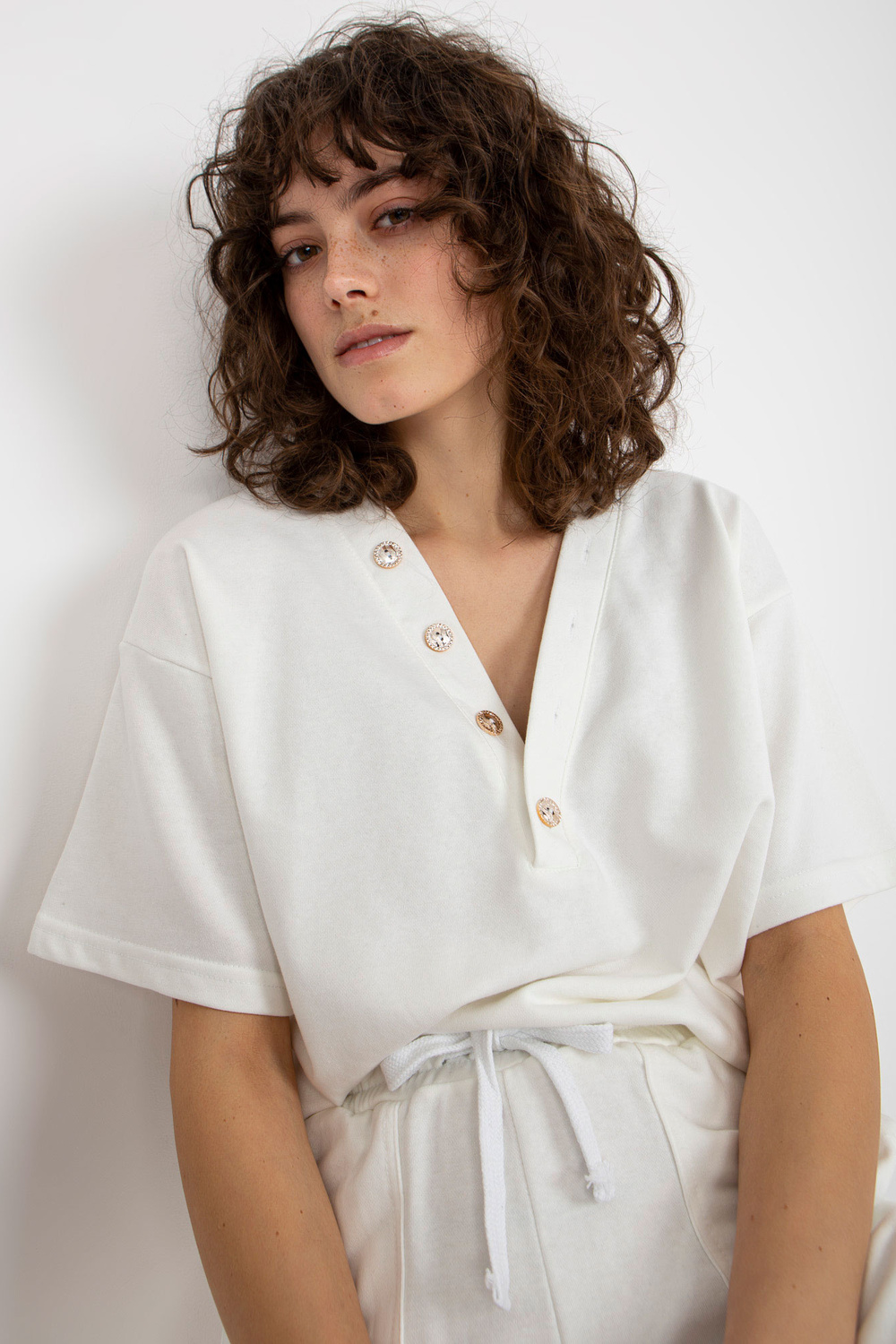 Ecru vasarinių megztinių komplektas su šortais ir palaidine.