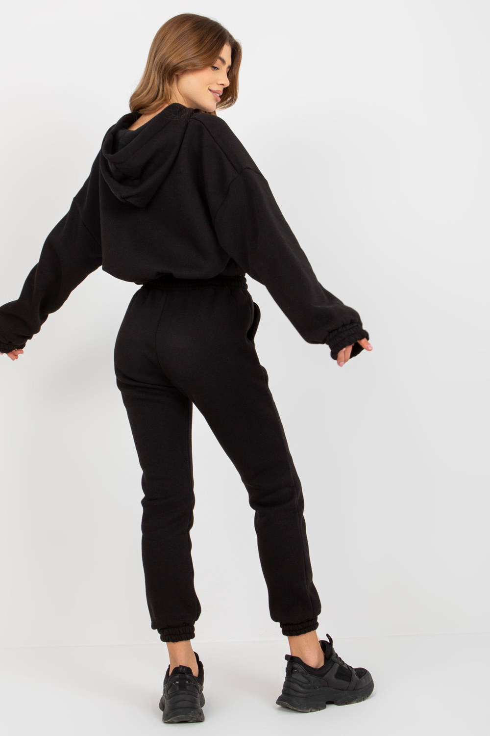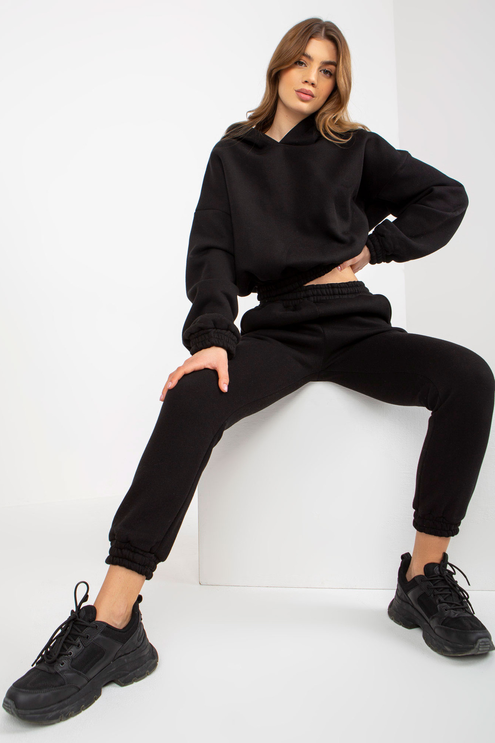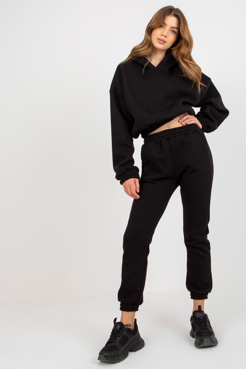 Juodų moteriškų megztinių komplektas su trumpu megztiniu.