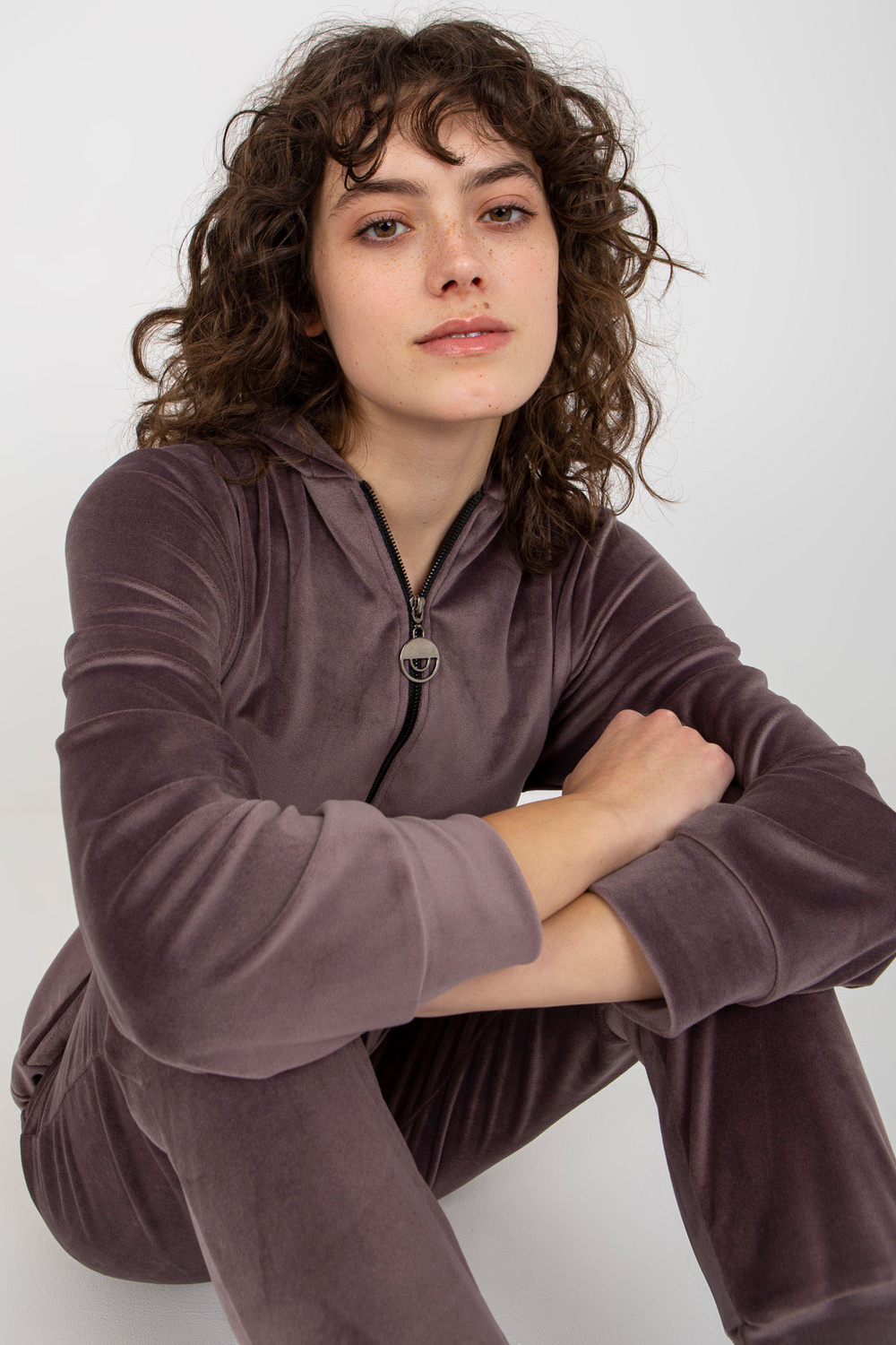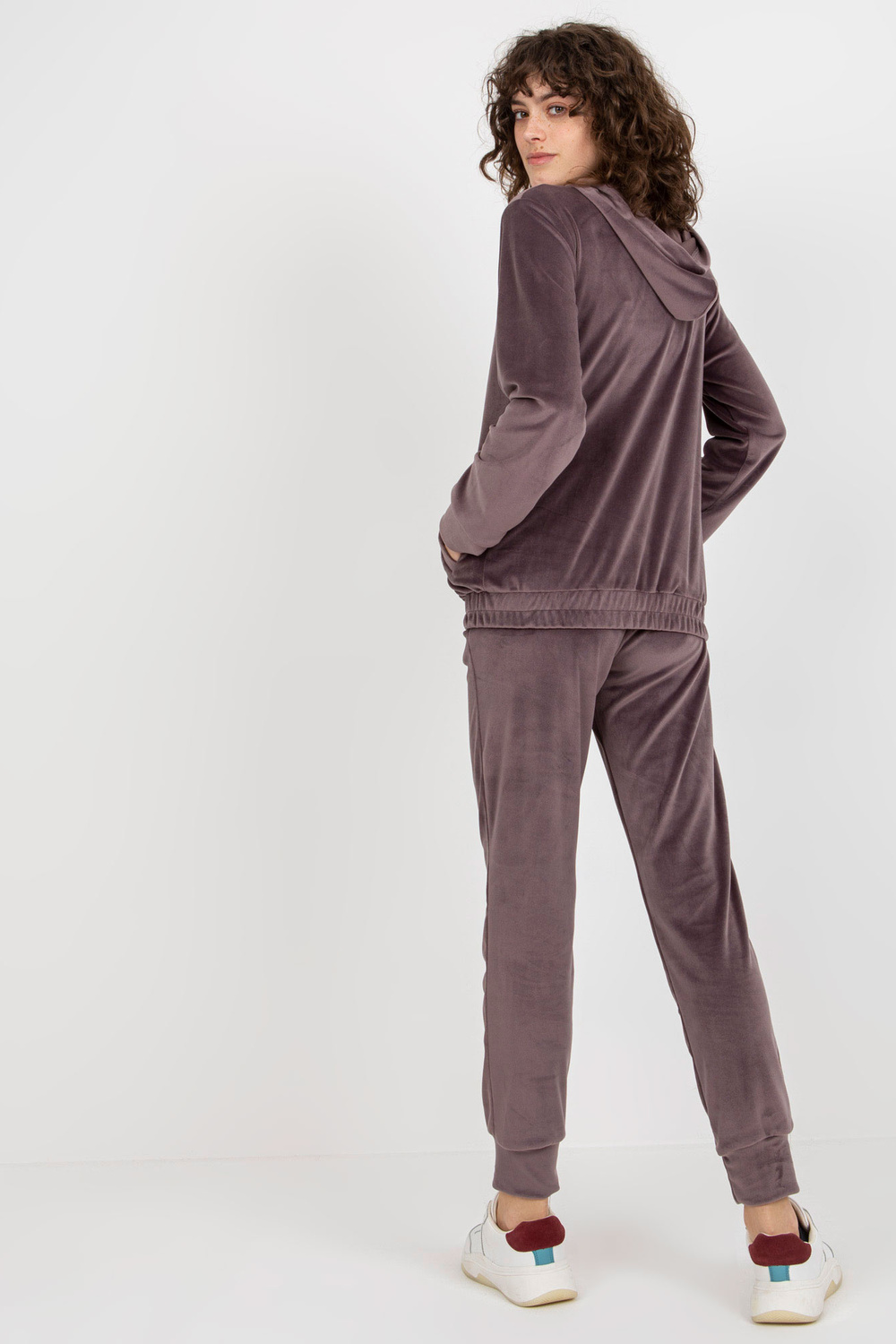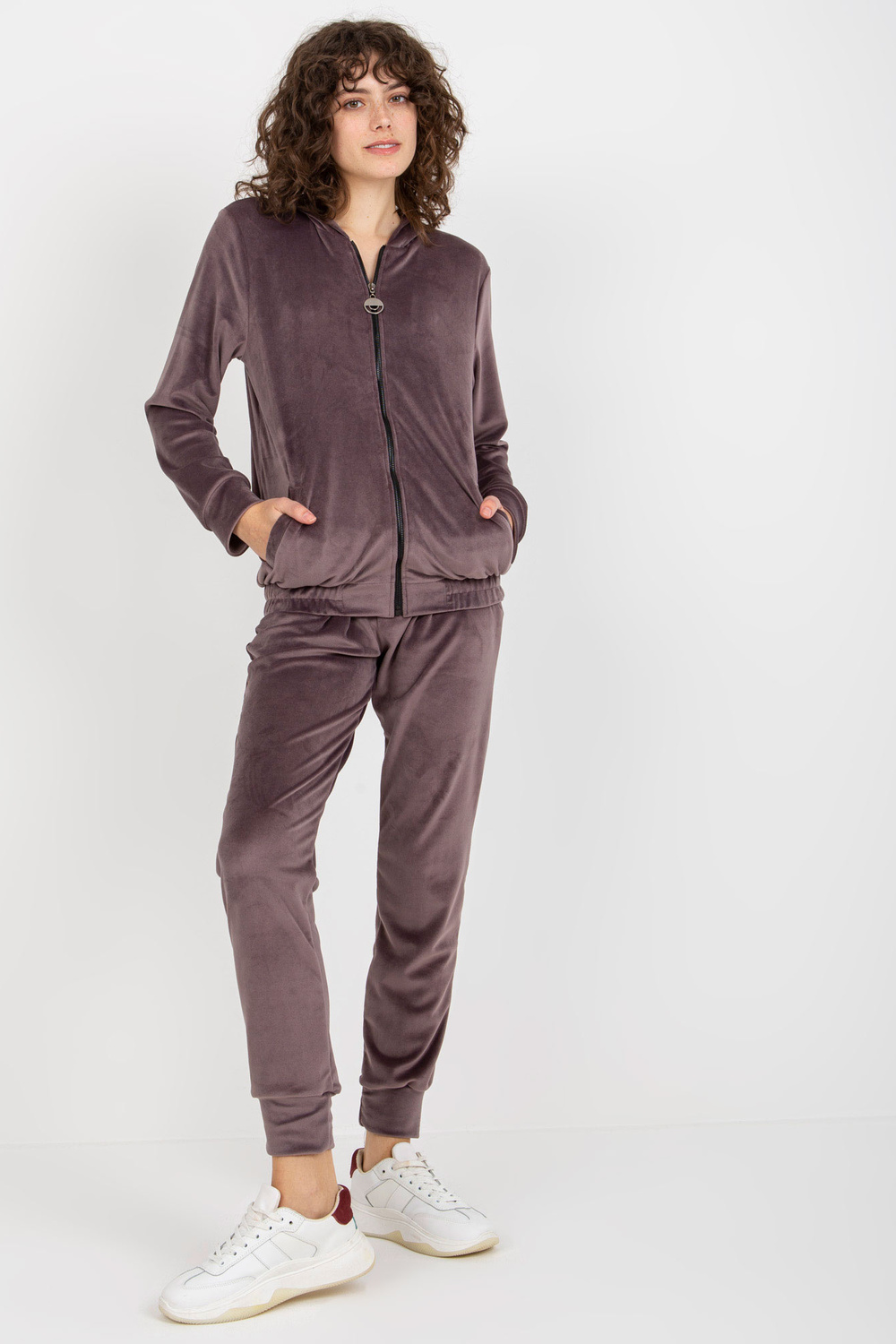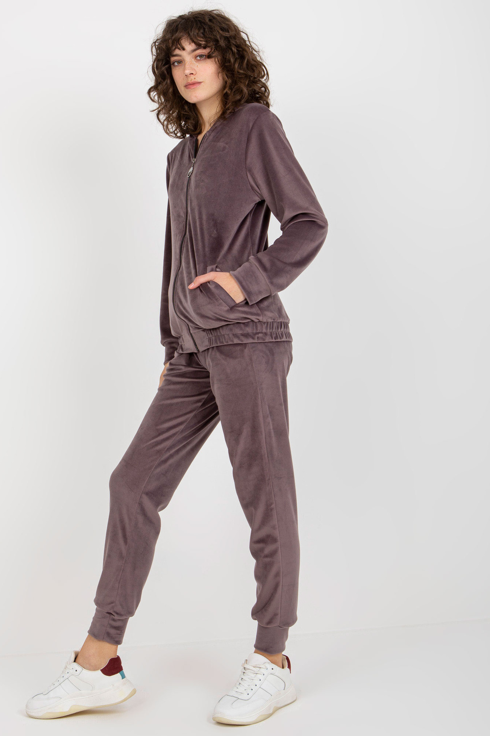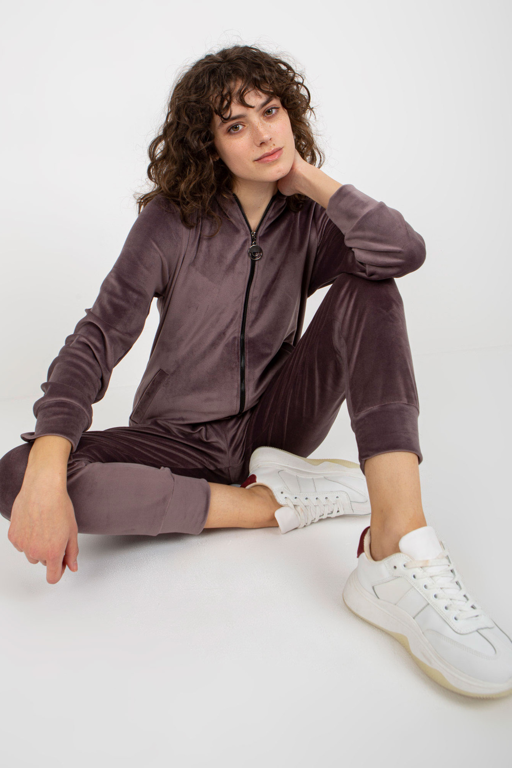 Violetinis dviejų dalių veliūrinis rinkinys su kelnėmis.
