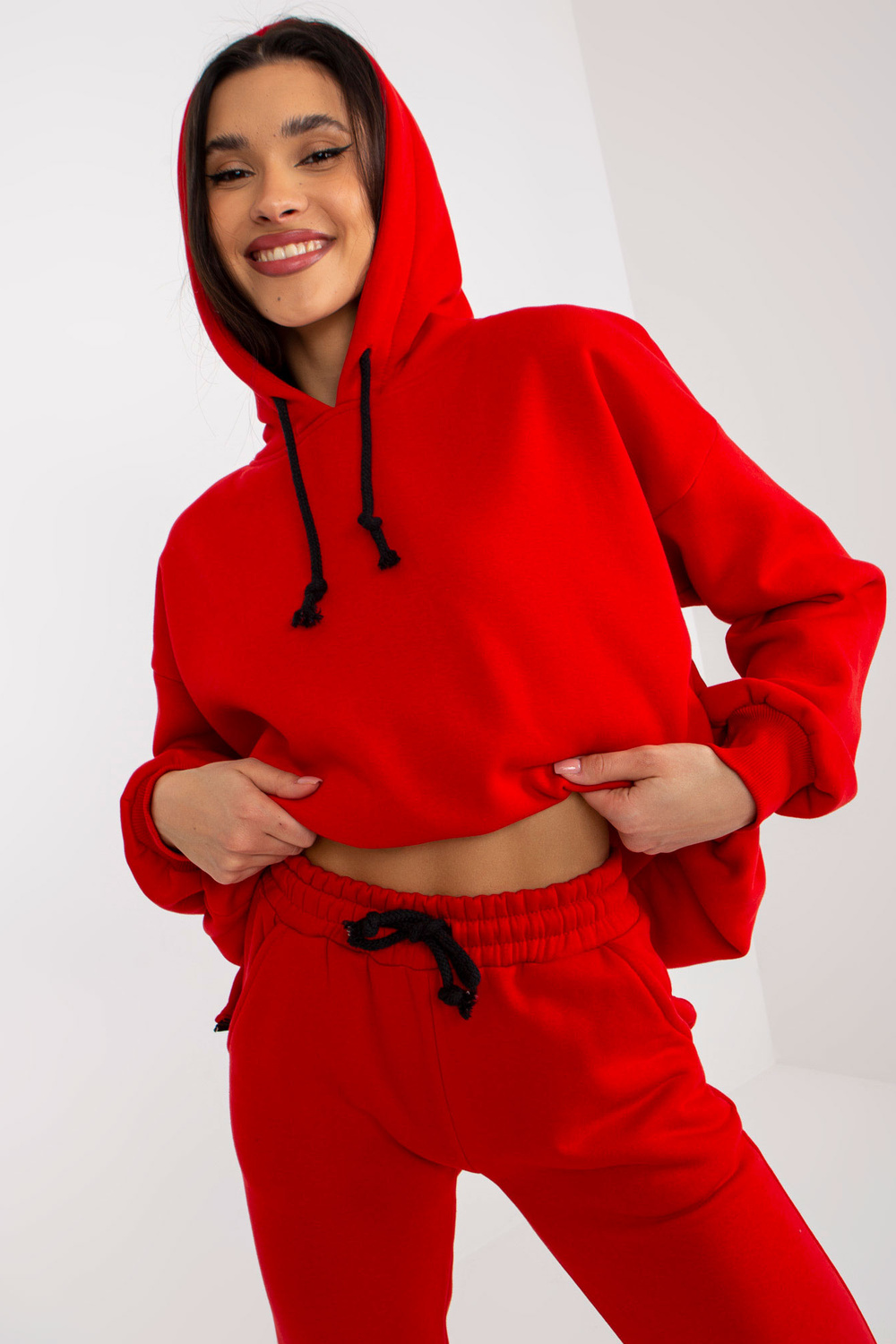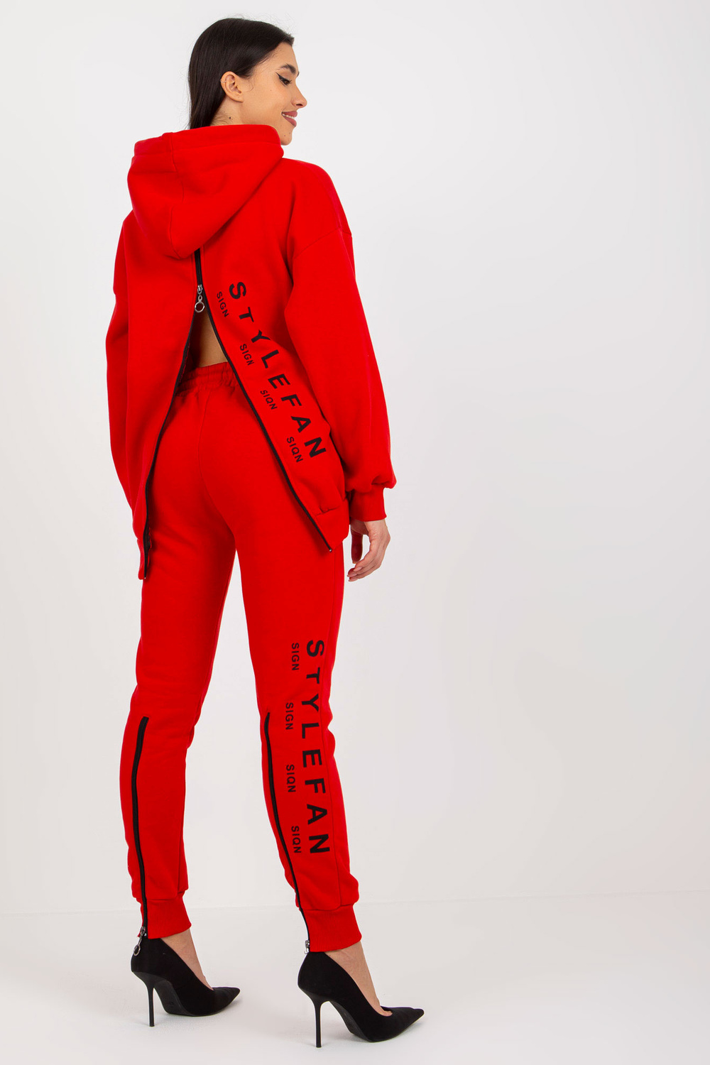 Raudonas moteriškas sportinio kostiumo komplektas su užrašais ir užtrauktukais.