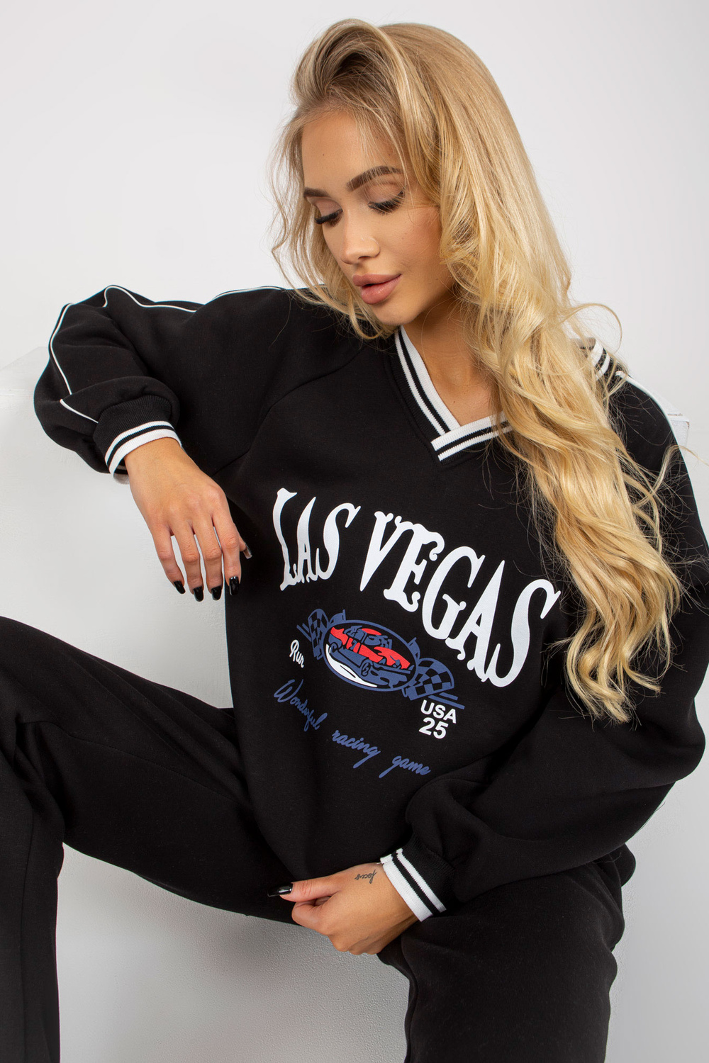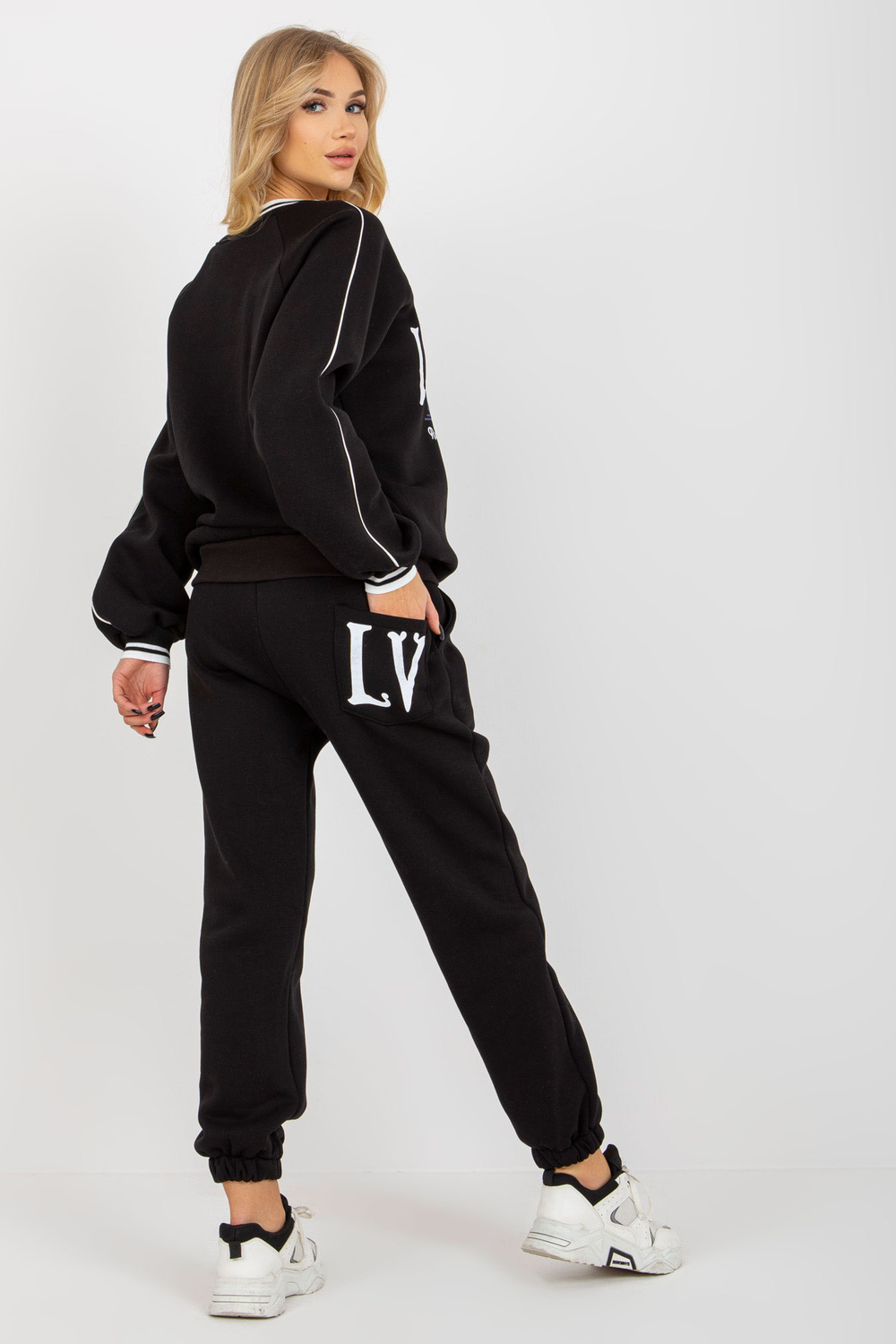 Juodas moteriškas oversize sportinio kostiumo komplektas su raštu.