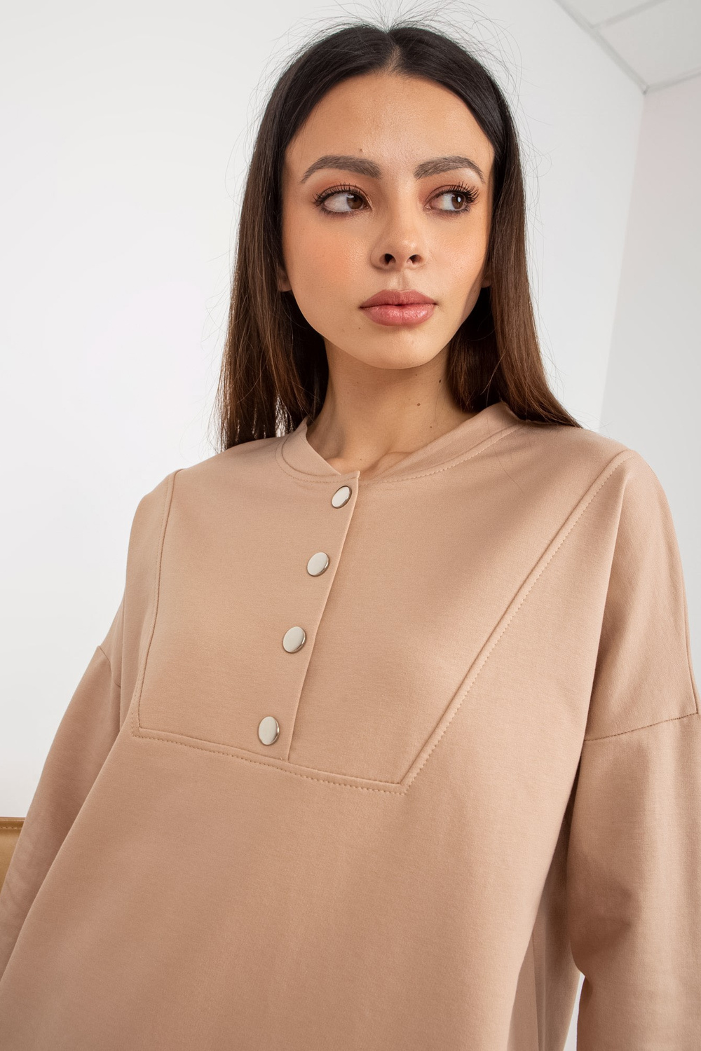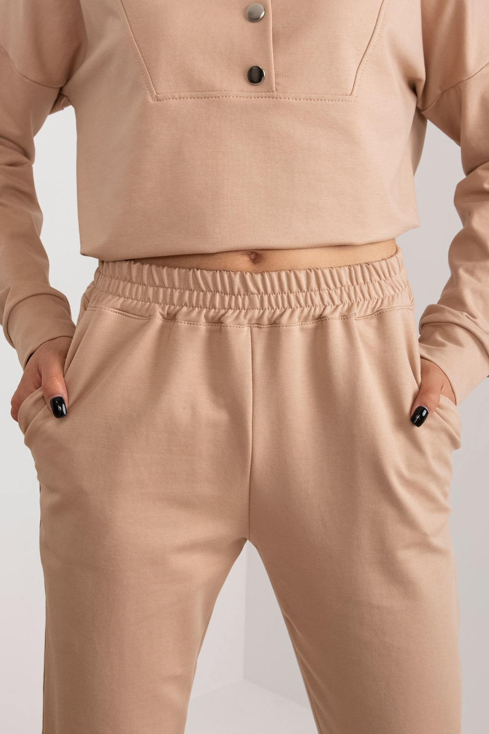 Komplekto matmenys S/M dydžiu matuojant plokščią: megztinio plotis po apačia rankos - 60 cm, rankovių ilgis - 62 cm, megztinio ilgis - 65 cm, kelnių juosmens plotis - 35 cm, juosmens aukštis - 30 cm, kelnių ilgis - 102 cm.
