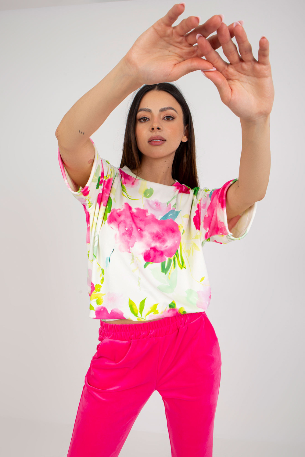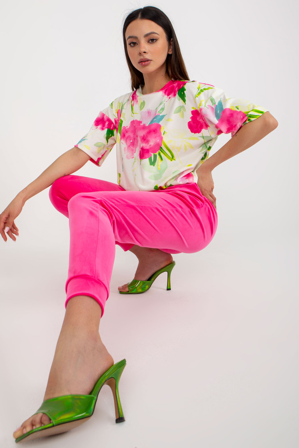 Komplekto matmenys S dydis matuojamas ant plokščio: palaidinės plotis po pažastimis - 64 cm, palaidinės ilgis - 60 cm, kelnių plotis ties juosmeniu - 33 cm, juosmens aukštis - 28 cm, kelnių ilgis - 98 cm.