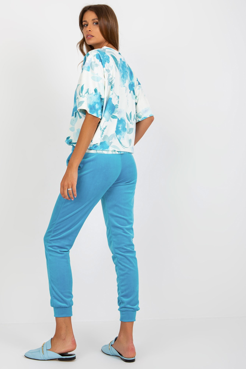 Komplekto matmenys S dydis matuojamas ant plokščio: palaidinės plotis po pažastimis - 64 cm, palaidinės ilgis - 60 cm, kelnių plotis ties juosmeniu - 33 cm, juosmens aukštis - 28 cm, kelnių ilgis - 98 cm.