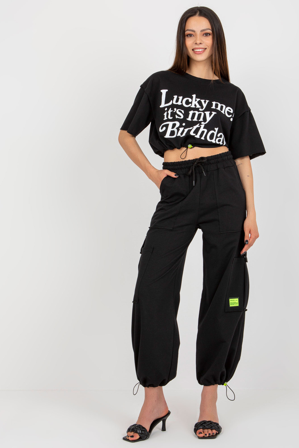 Komplekto matmenys S dydis matuojamas ant plokščio: palaidinės plotis po pažastimis - 57 cm, palaidinės ilgis - 48 cm, kelnių plotis ties juosmeniu - 35 cm, juosmens aukštis - 33 cm, kelnių ilgis - 99 cm.