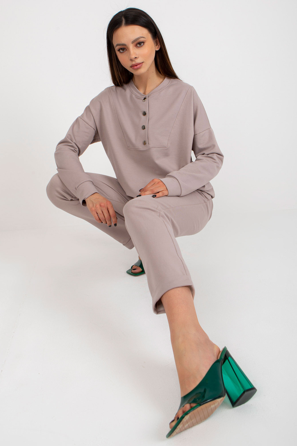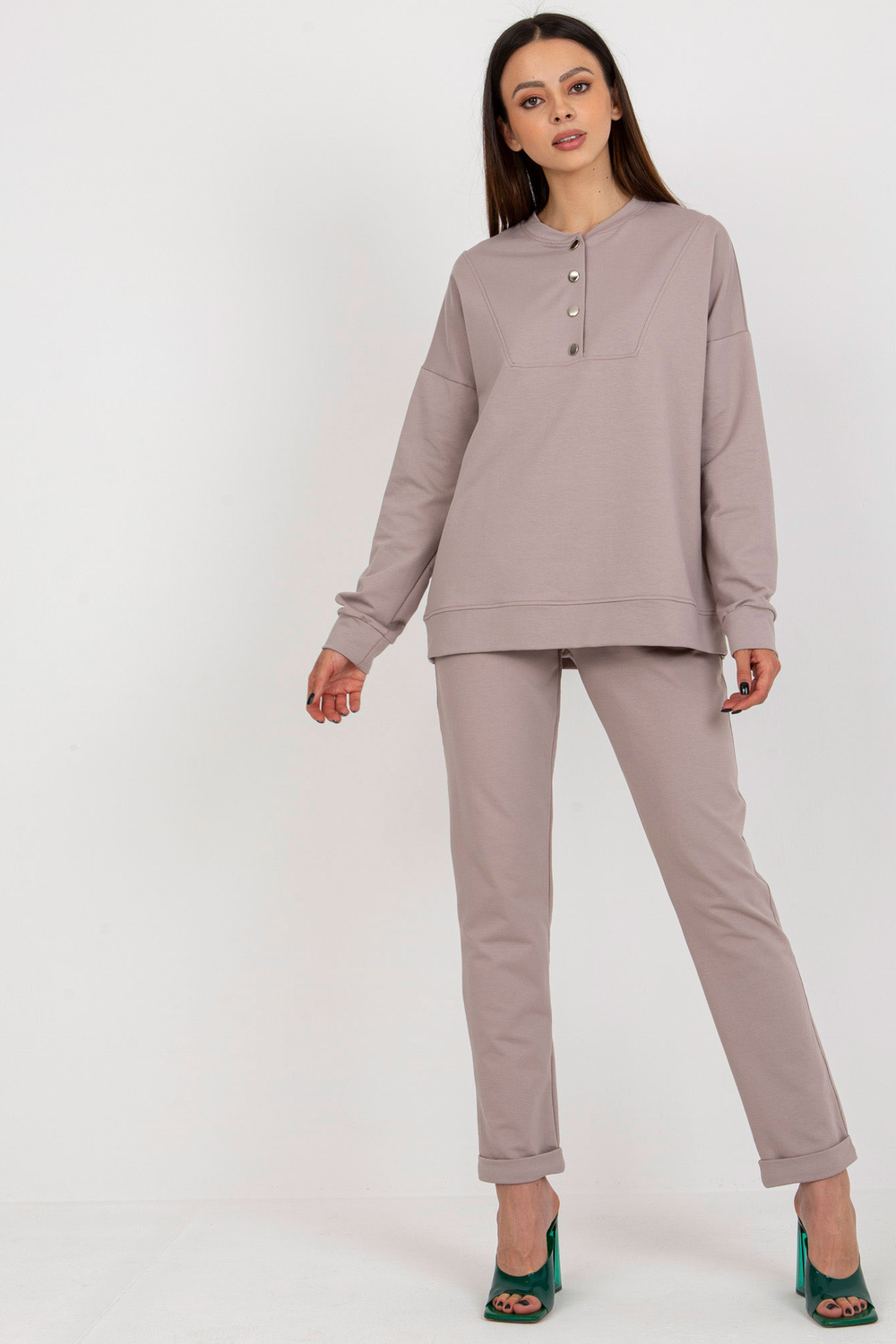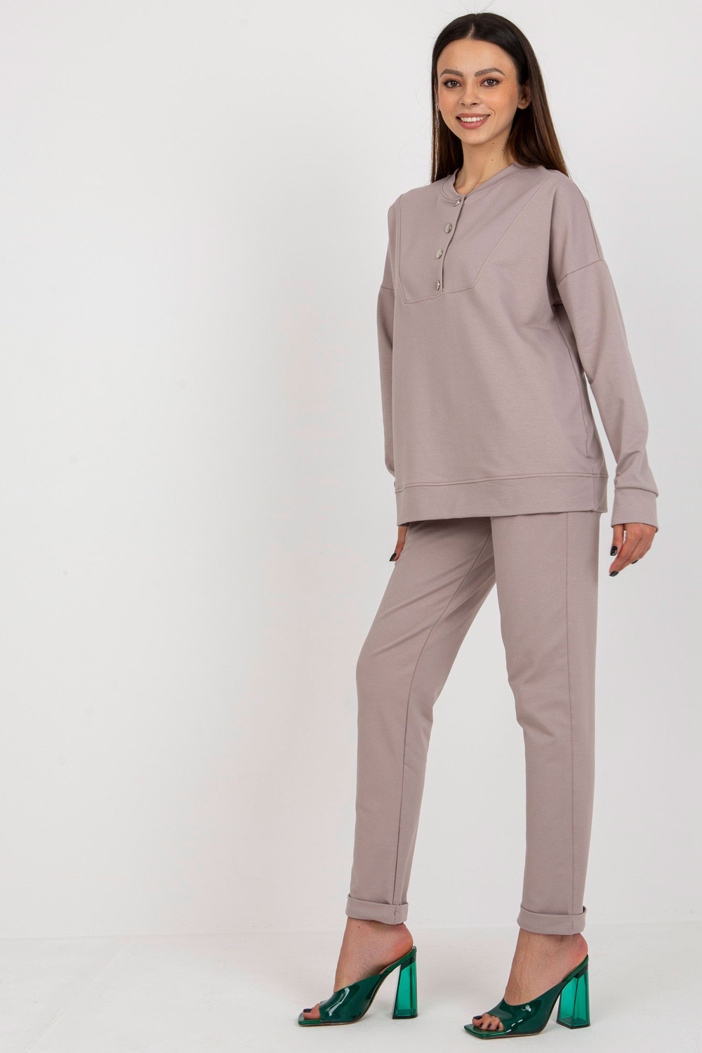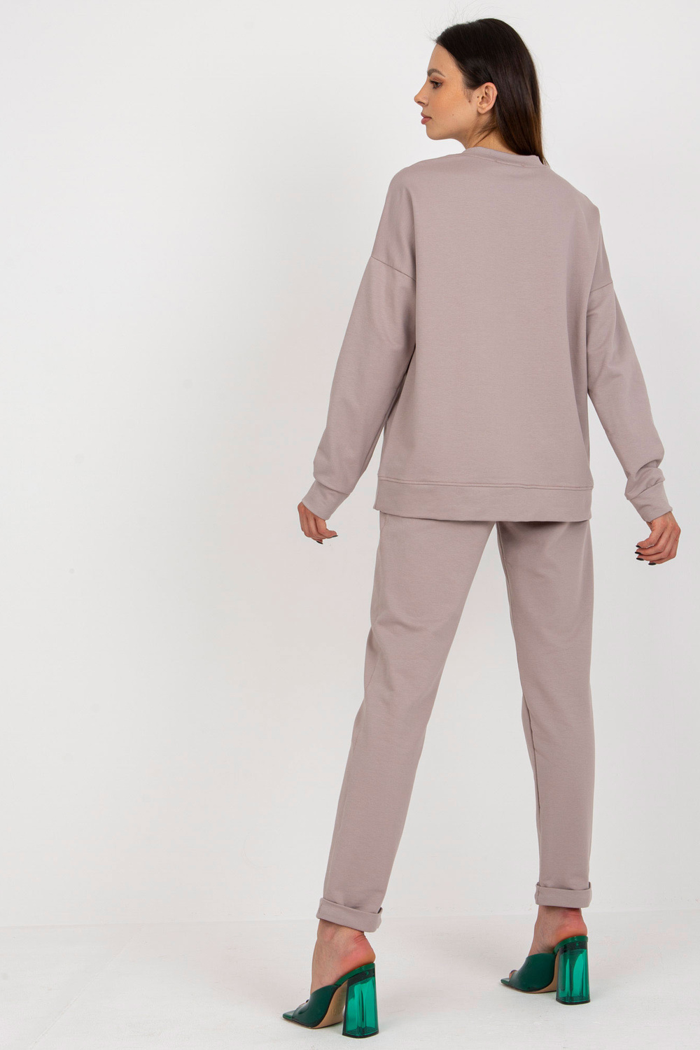 Komplekto matmenys S/M dydžiu matuojant plokščią: megztinio plotis po apačia rankos - 60 cm, rankovių ilgis - 62 cm, megztinio ilgis - 65 cm, kelnių juosmens plotis - 35 cm, juosmens aukštis - 30 cm, kelnių ilgis - 102 cm.