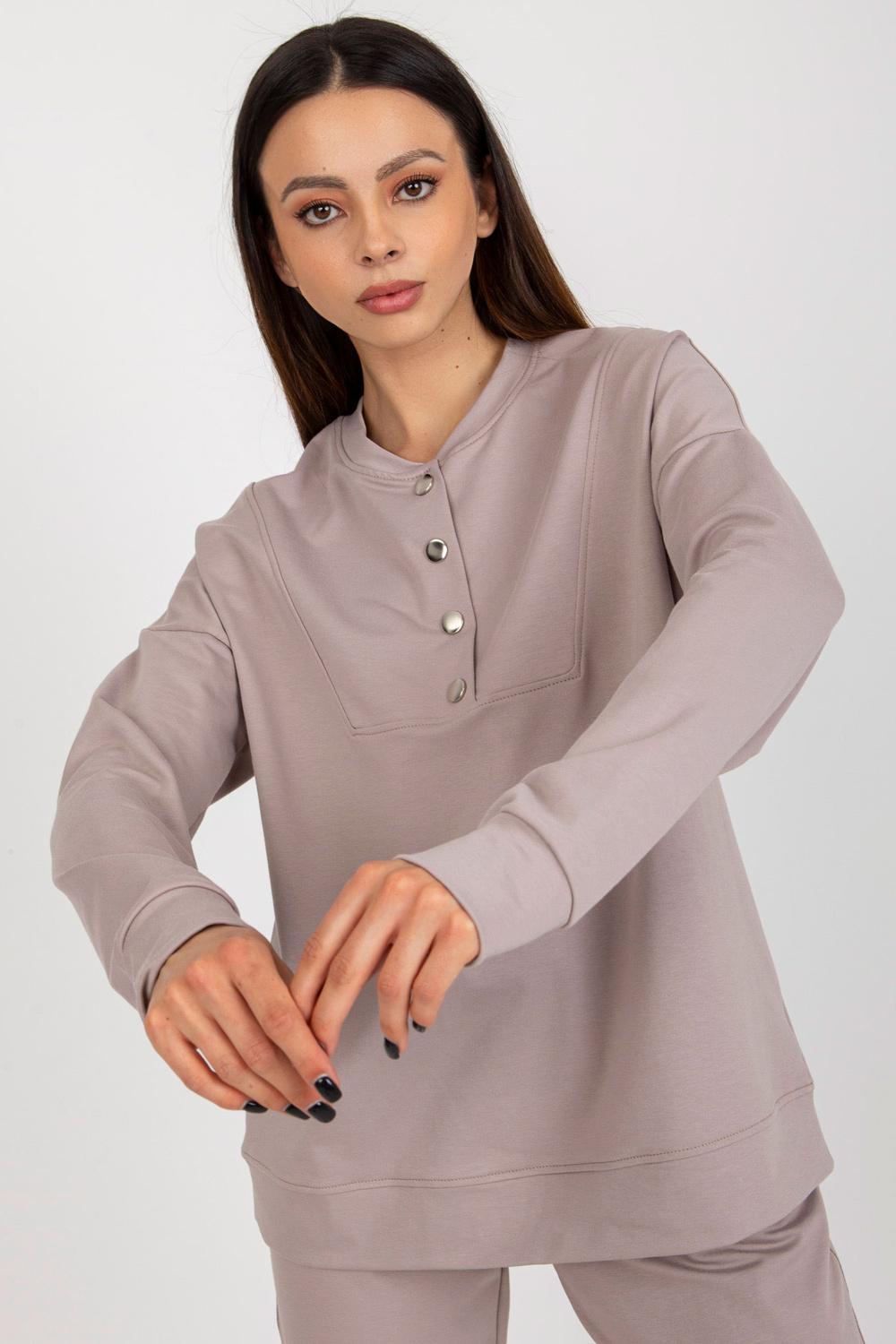 Modelis dėvi S/M dydį. Modelio matmenys: ūgis 175 cm, krūtinė 84 cm, juosmuo 61 cm, klubai 91 cm.