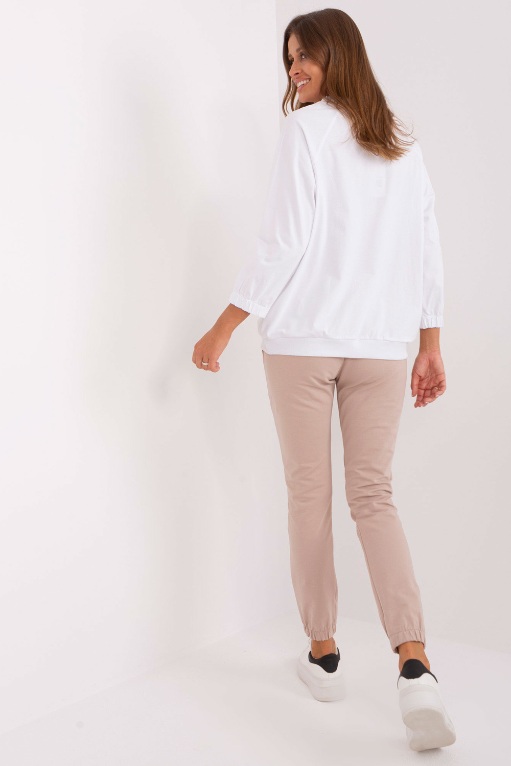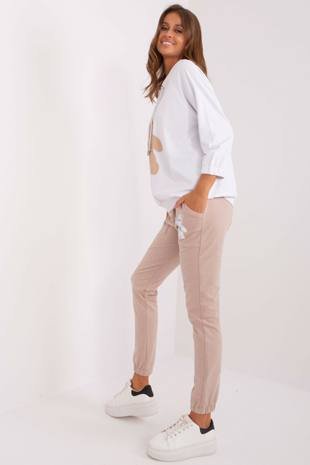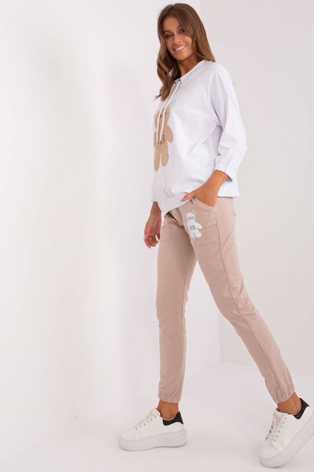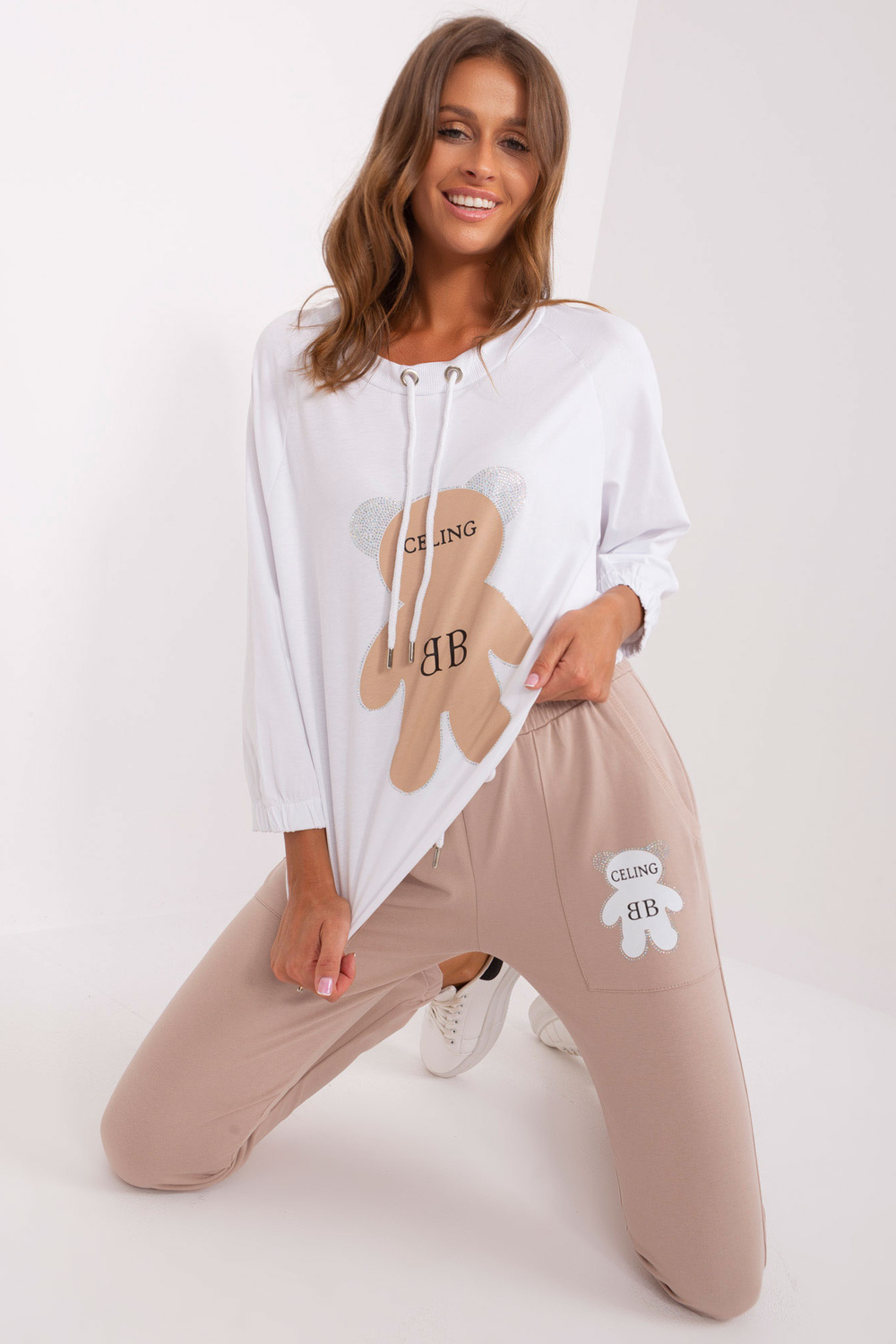 Komplekto matmenys S/M dydžiu matuojant plokščią: megztinio plotis po apačia rankos - 60 cm, rankovių ilgis - 55 cm, megztinio ilgis - 68 cm, kelnių juosmens plotis - 36 cm, juosmens aukštis - 32 cm, kelnių ilgis - 98 cm.