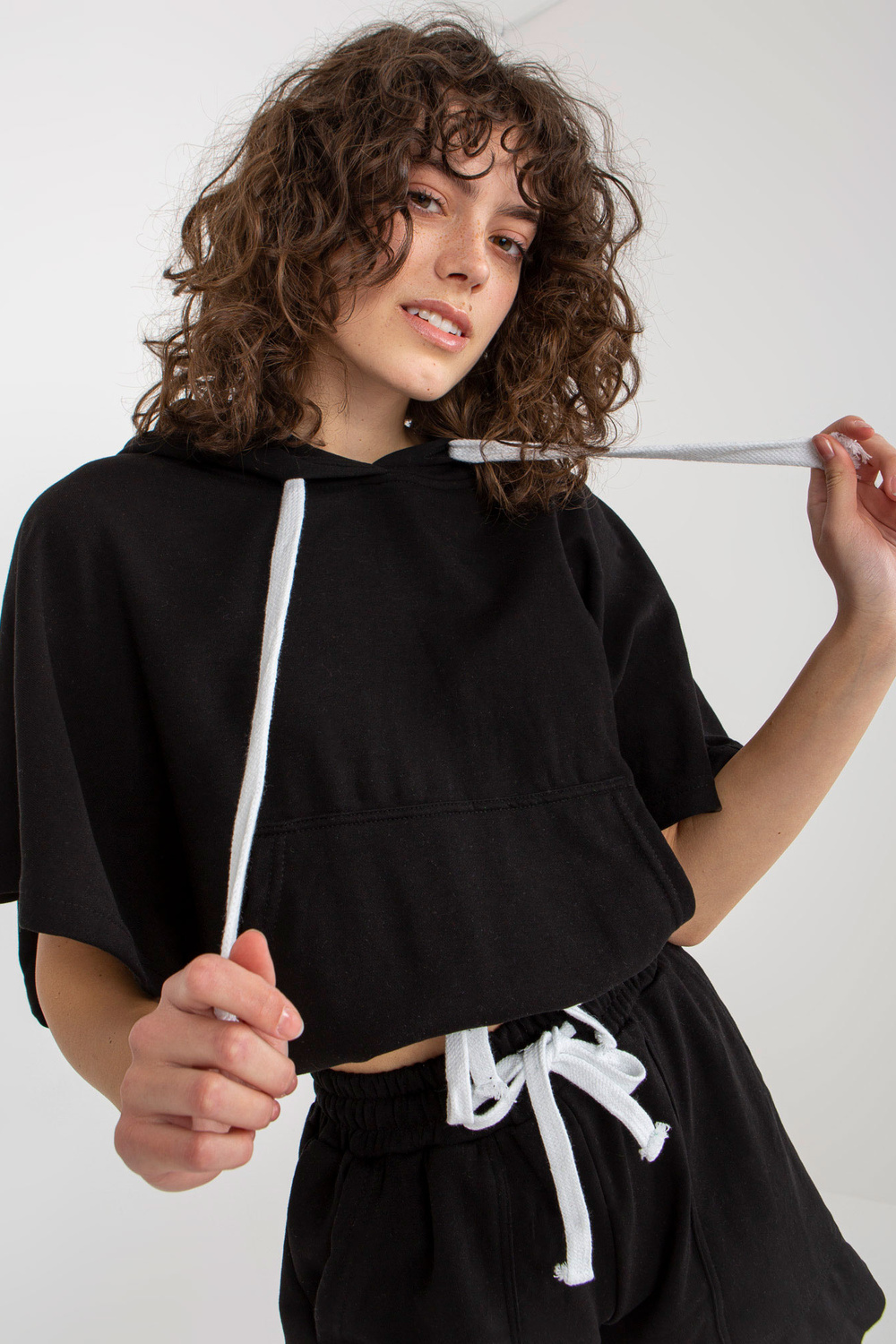 Komplekto matmenys vieno dydžio matuojant plokščią: megztinio plotis po pažastimis - 67 cm, rankovės ilgis - 29 cm, megztinio ilgis - 55 cm, plotis šortų ties juosmeniu - 34 cm, būklės aukštis - 30 cm, šortų ilgis - 41 cm.
