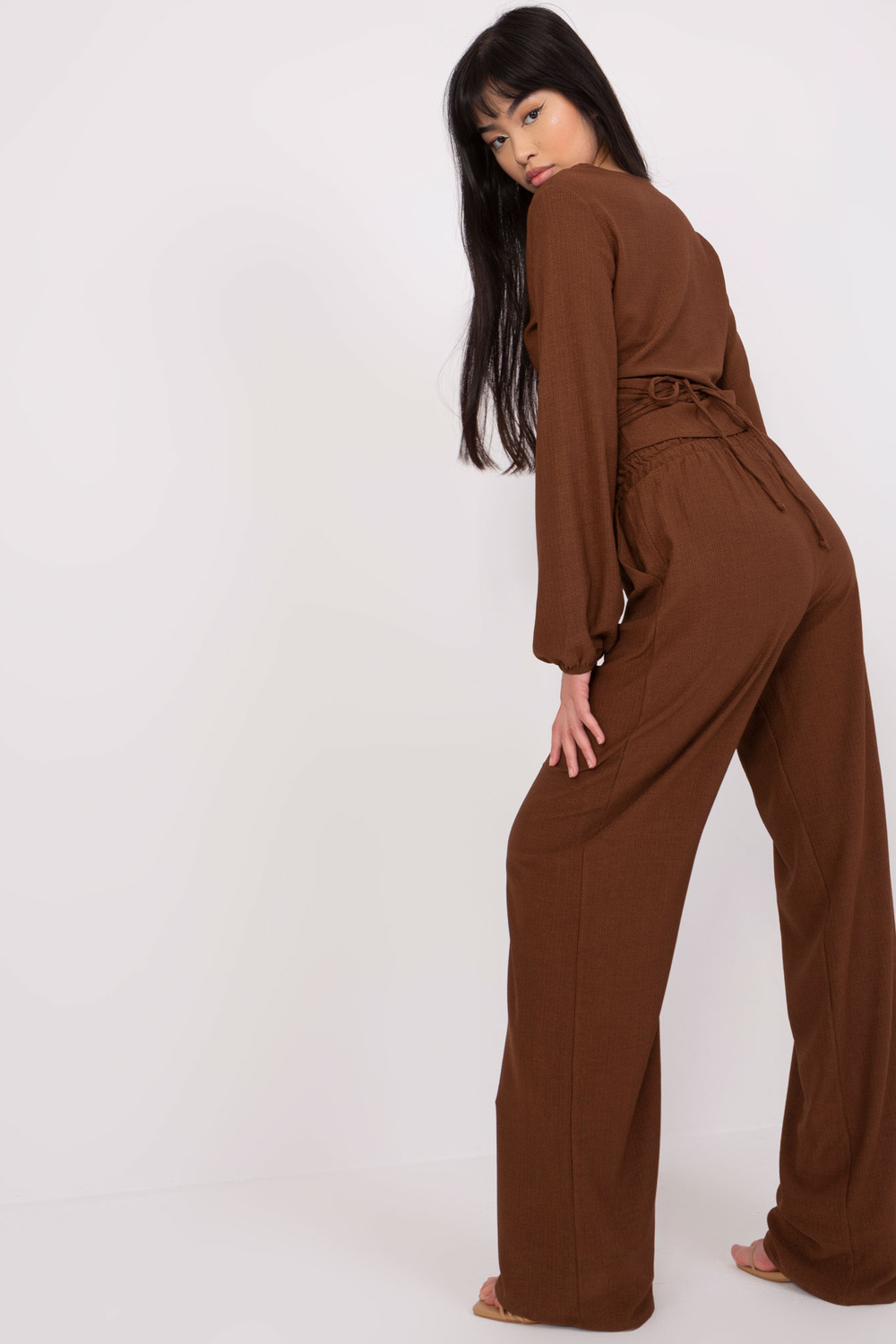 Komplekto matmenys S/M dydžiu matuojant plokščią: palaidinės plotis po apačia rankos - 54 cm, palaidinės ilgis - 51 cm, rankovių ilgis - 60 cm, kelnių juosmens plotis - 35 cm, juosmens aukštis - 32 cm, kelnių ilgis - 113 cm.