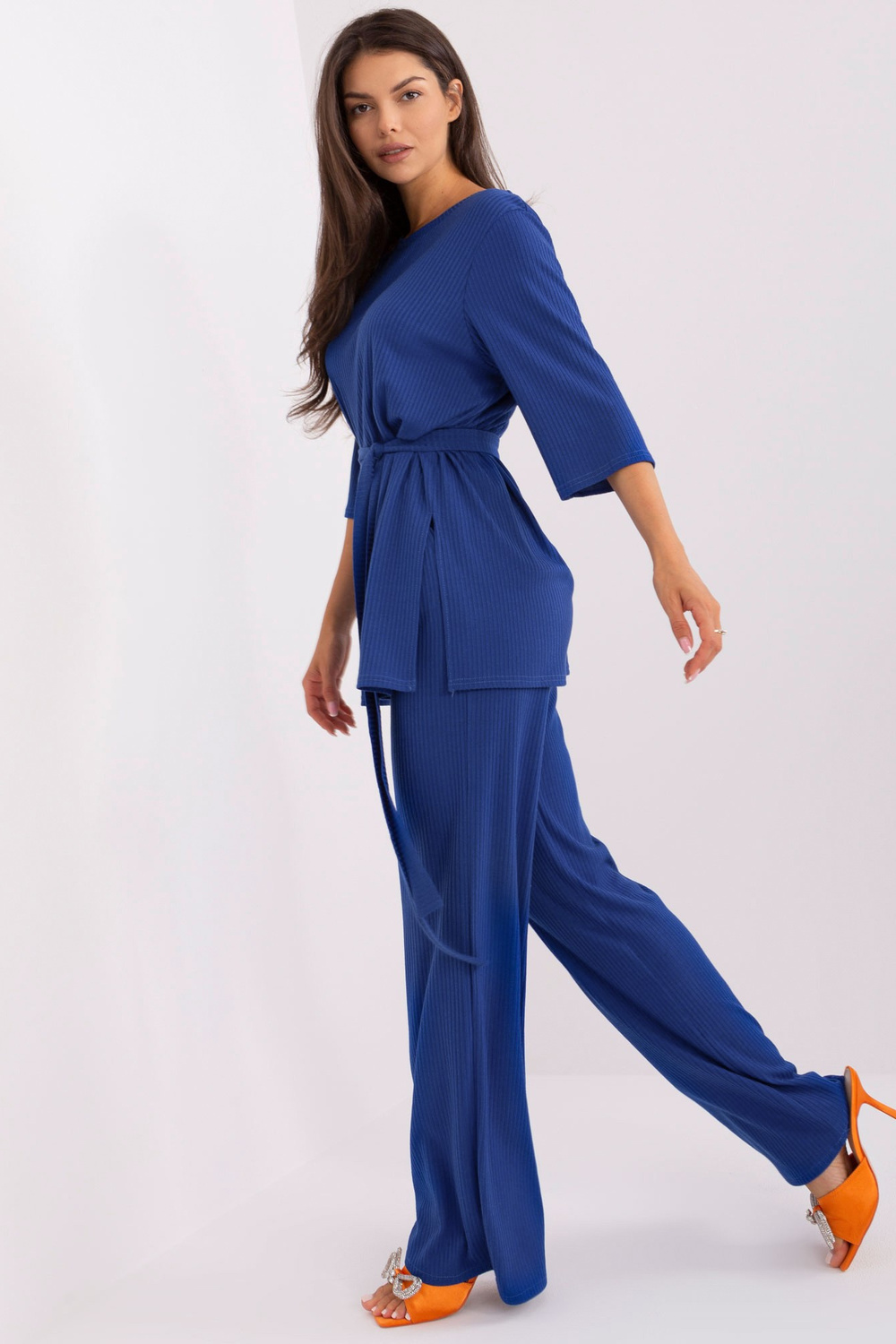 Komplekto matmenys S/M dydžiu matuojant plokščią: palaidinės plotis po apačia rankos - 60 cm, rankovių ilgis - 40 cm, palaidinės ilgis - 78 cm, kelnių juosmens plotis - 32 cm, juosmens aukštis - 33 cm, kelnių ilgis - 114 cm.