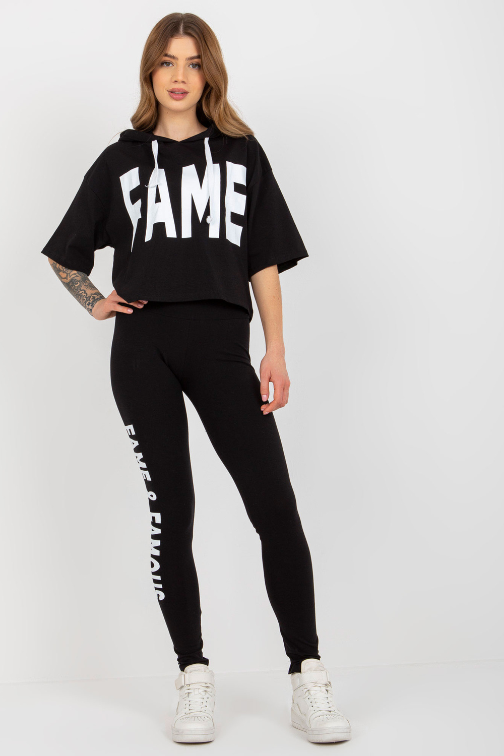 Juodas laisvalaikio komplektas su antblauzdžiais ir užrašais.