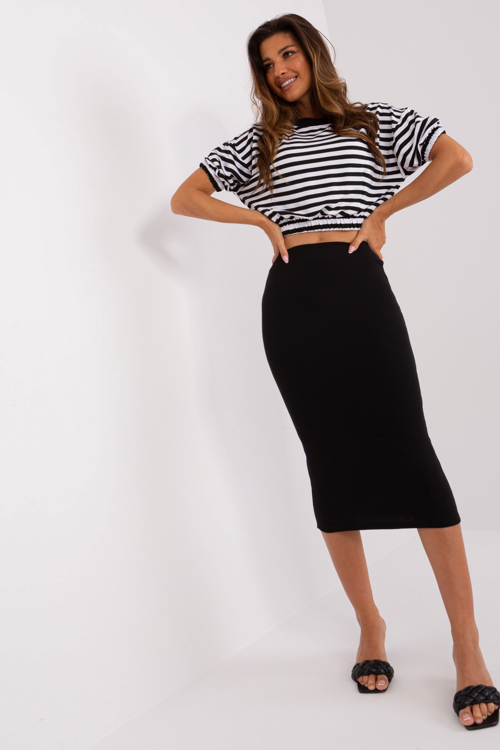 Komplekto matmenys vieno dydžio, matuojamas plokščias: palaidinės plotis po apačia rankos - 55 cm, palaidinės ilgis - 47 cm, sijono plotis ties juosmeniu - 33 cm, sijono ilgis - 74 cm.