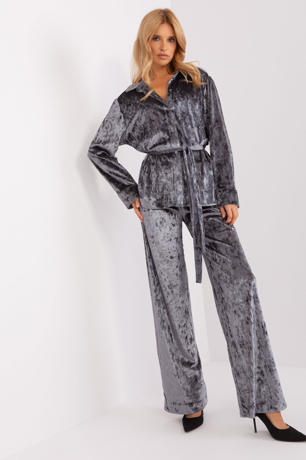 Komplekto matmenys S/M dydžiu matuojant plokščią: marškinių plotis po pažastimis - 58 cm, rankovių ilgis - 60 cm, marškinių ilgis - 70 cm, kelnių juosmens plotis - 31 cm, juosmens aukštis - 34 cm, kelnių ilgis - 110 cm.