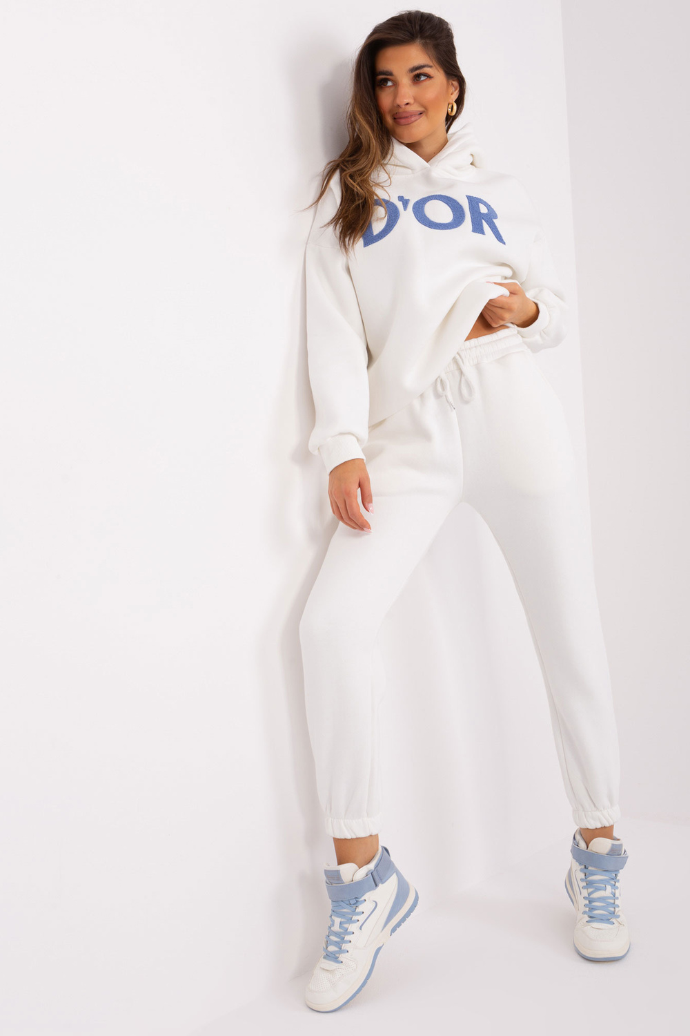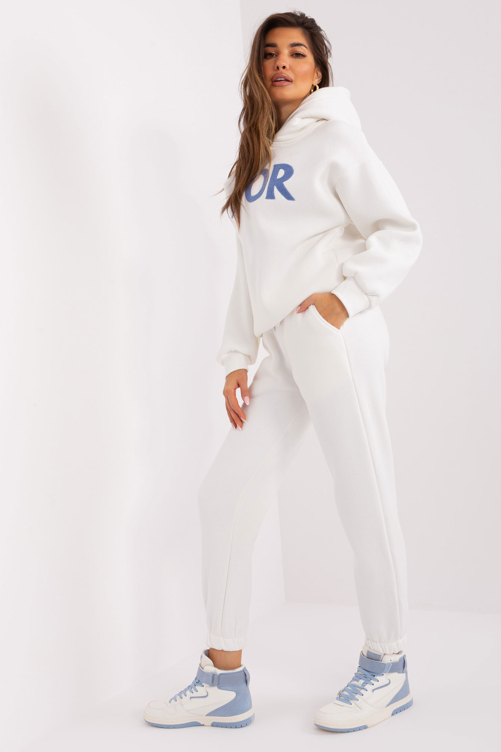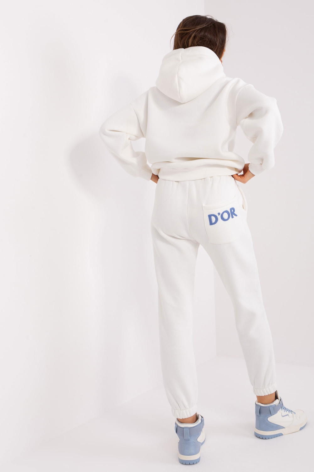 Komplekto matmenys vieno dydžio, matuojamas plokščias: megztinio plotis po rankos - 53 cm, rankovių ilgis - 60 cm, megztinio ilgis - 67 cm, kelnių juosmens plotis - 38 cm, juosmens aukštis - 29 cm, kelnių ilgis - 90 cm.