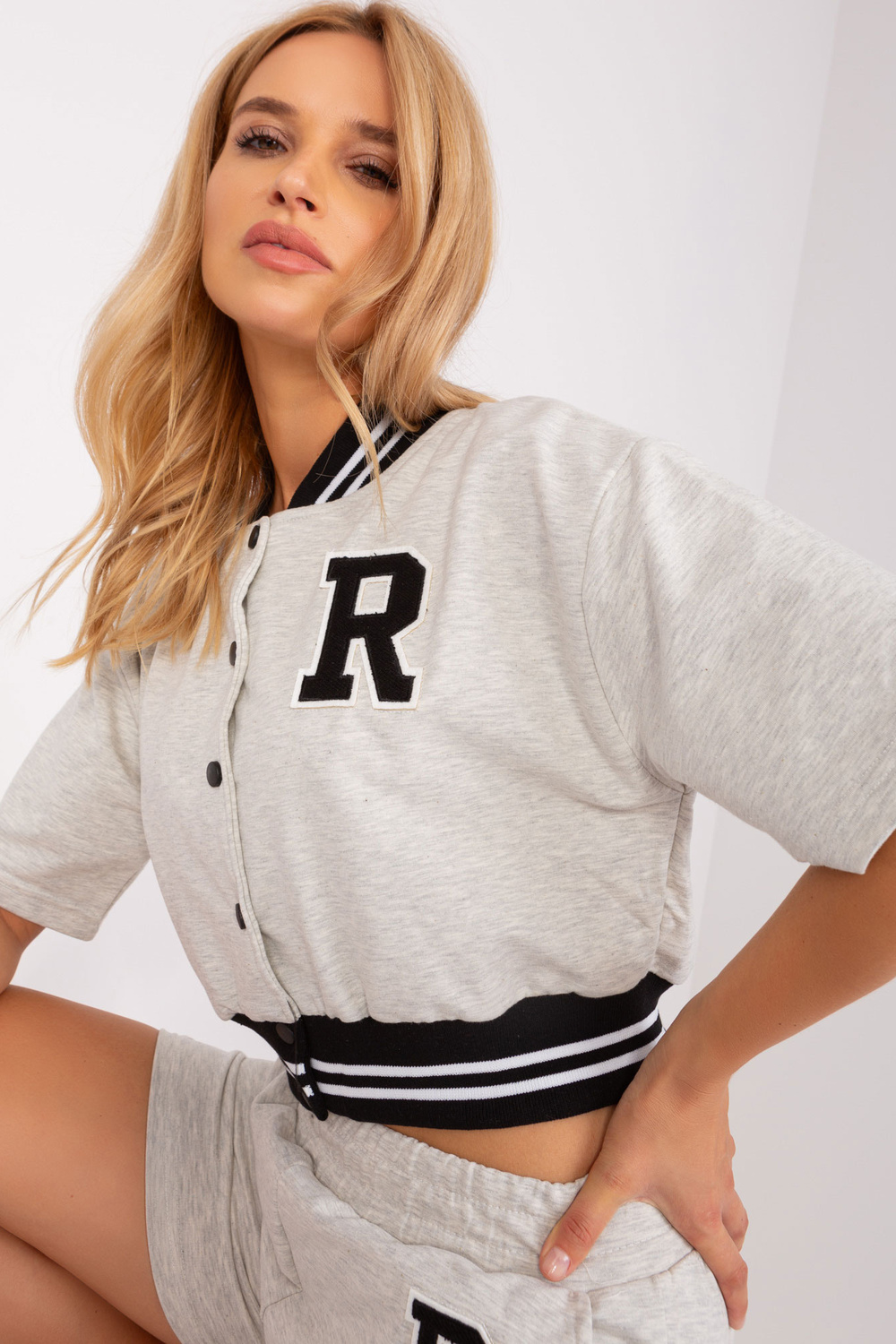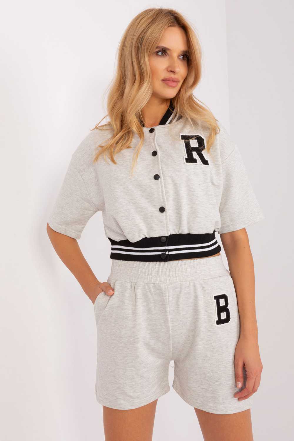 Komplekto matmenys vieno dydžio, matuojamas plokščias: megztinio plotis po apačia rankos - 52 cm, rankovių ilgis - 22 cm, megztinio ilgis - 46 cm, juosmens plotis - 30 cm, šortų ilgis - 39 cm.