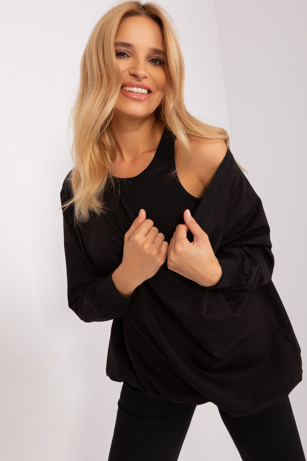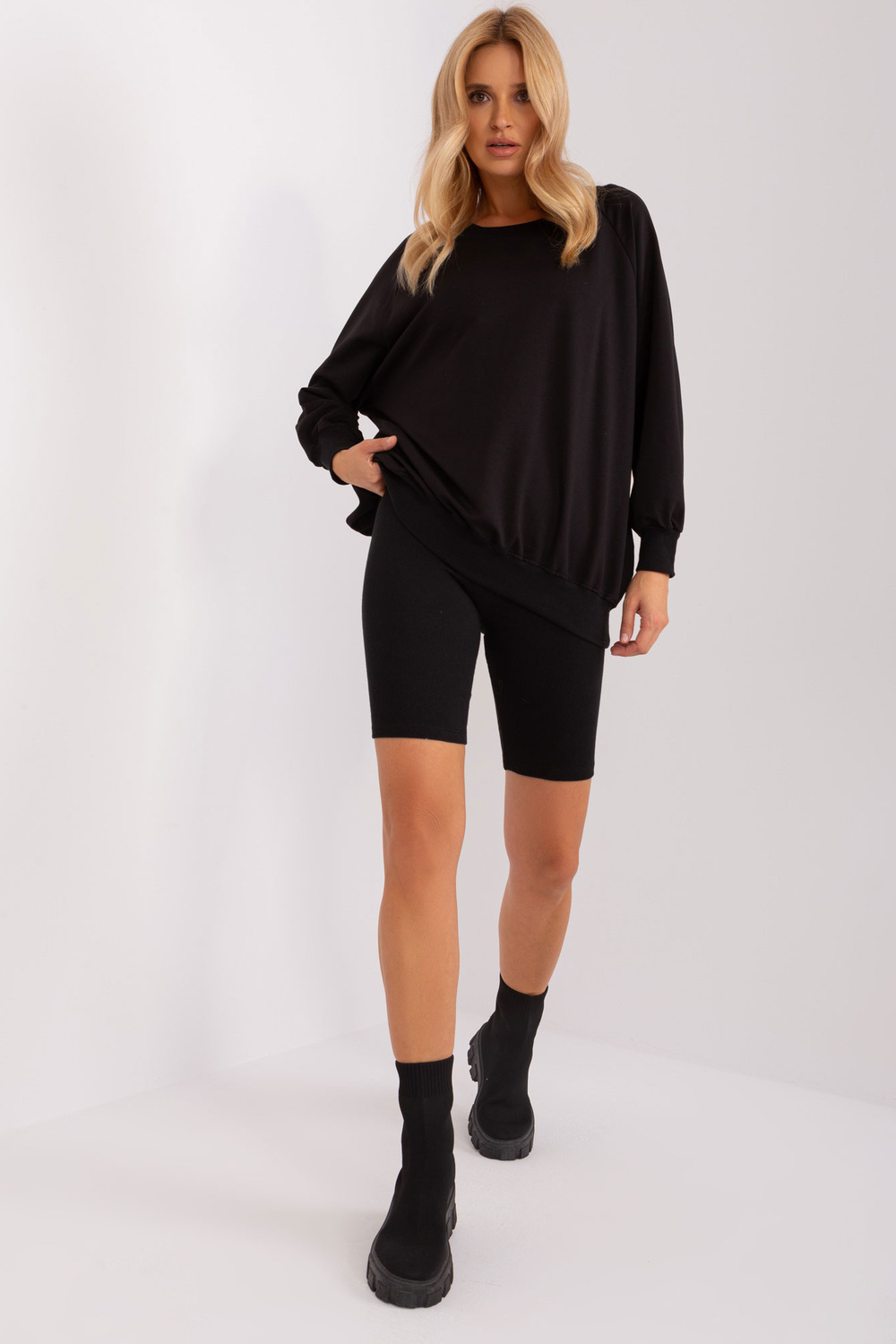 Komplekto matmenys vieno dydžio, matuojamas plokščias: megztinio plotis po apačia rankos - 69 cm, rankovių ilgis - 56 cm, megztinio ilgis - 68 cm, viršaus plotis po pažastimis - 32 cm, viršaus ilgis - 41 cm, juosmens plotis - 30 cm, dviratininko ilgis - 46 cm.