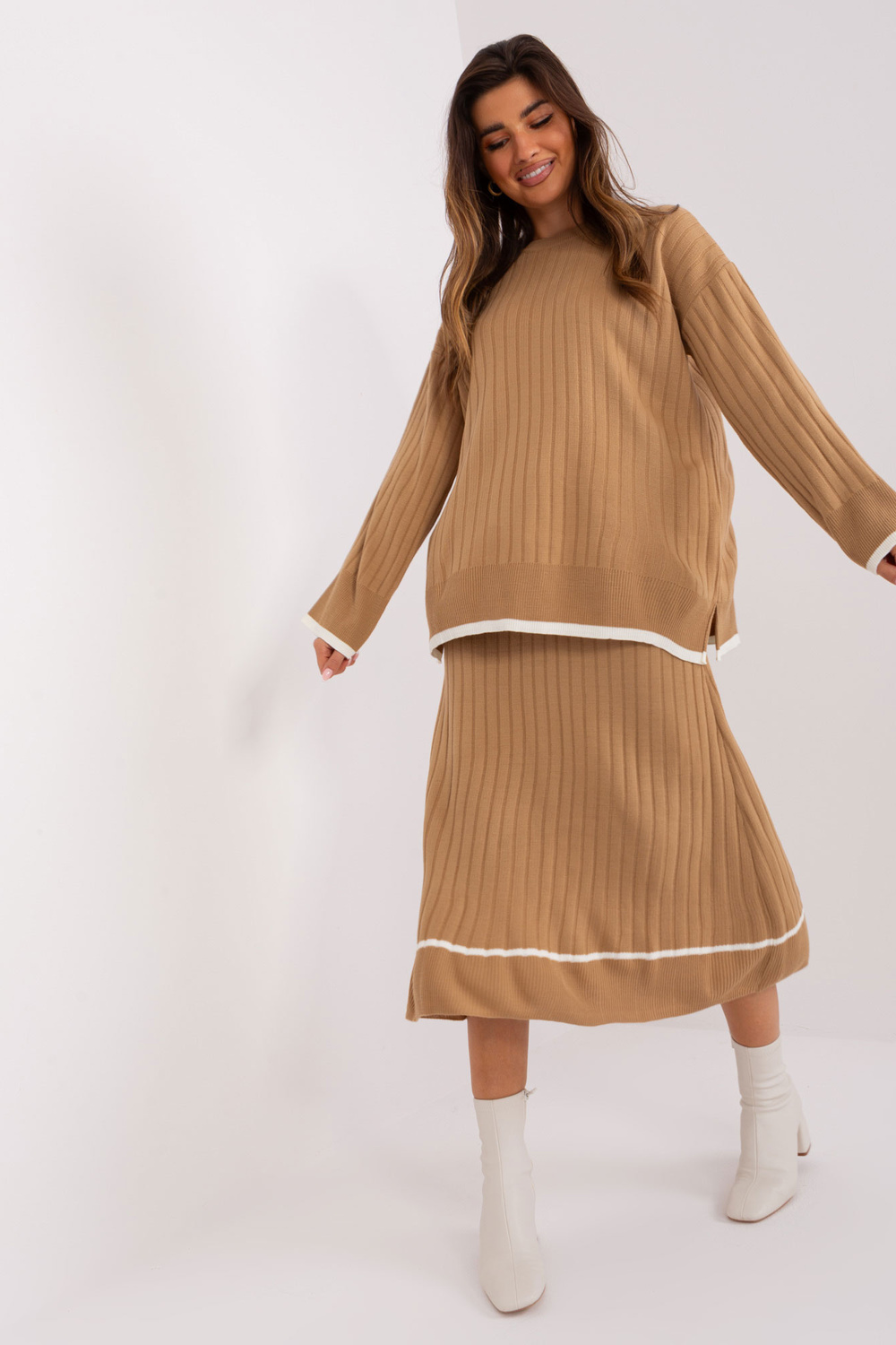 Komplekto matmenys vieno dydžio, matuojamas plokščias: plotis po pažastimis - 56 cm, rankovių ilgis - 58 cm, megztinio ilgis - 66 cm, juosmens plotis - 30 cm, sijono ilgis - 82 cm.