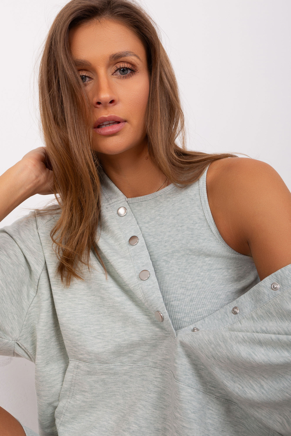 Modelis dėvi vieno dydžio dydį. Modelio matmenys: ūgis 176 cm, krūtinė 85 cm, juosmuo 64 cm, klubai 92 cm.
