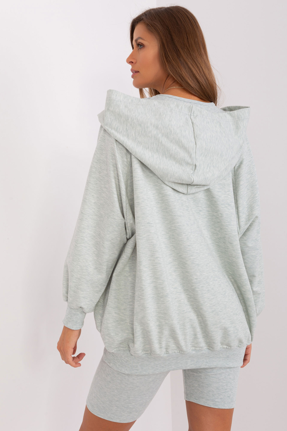 Komplekto matmenys vieno dydžio, matuojamas plokščias: megztinio plotis po apačia rankos - 65 cm, rankovių ilgis - 59 cm, megztinio ilgis - 63 cm, viršaus plotis po pažastimis - 29 cm, viršaus ilgis - 42 cm, juosmens plotis - 29 cm, dviratininko ilgis - 47 cm.